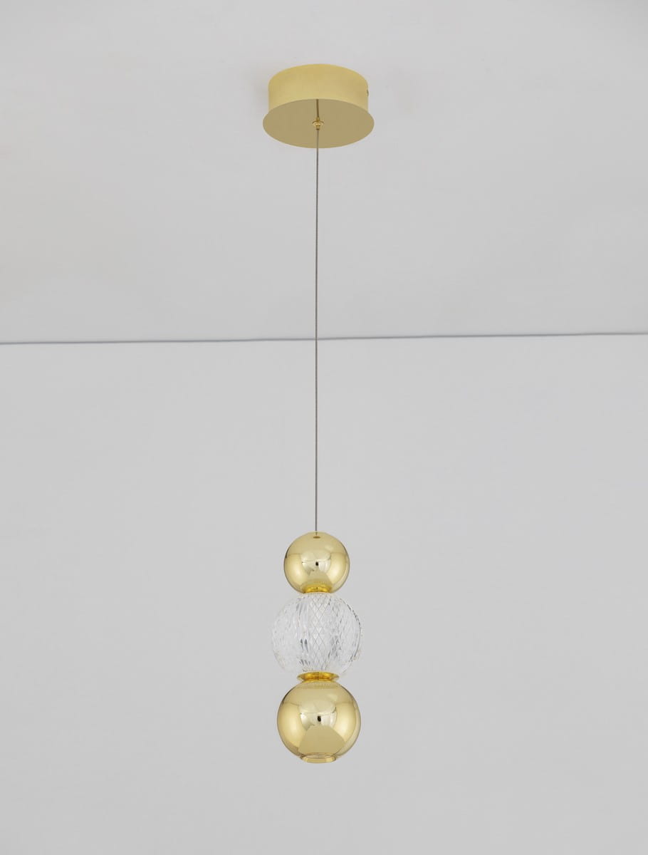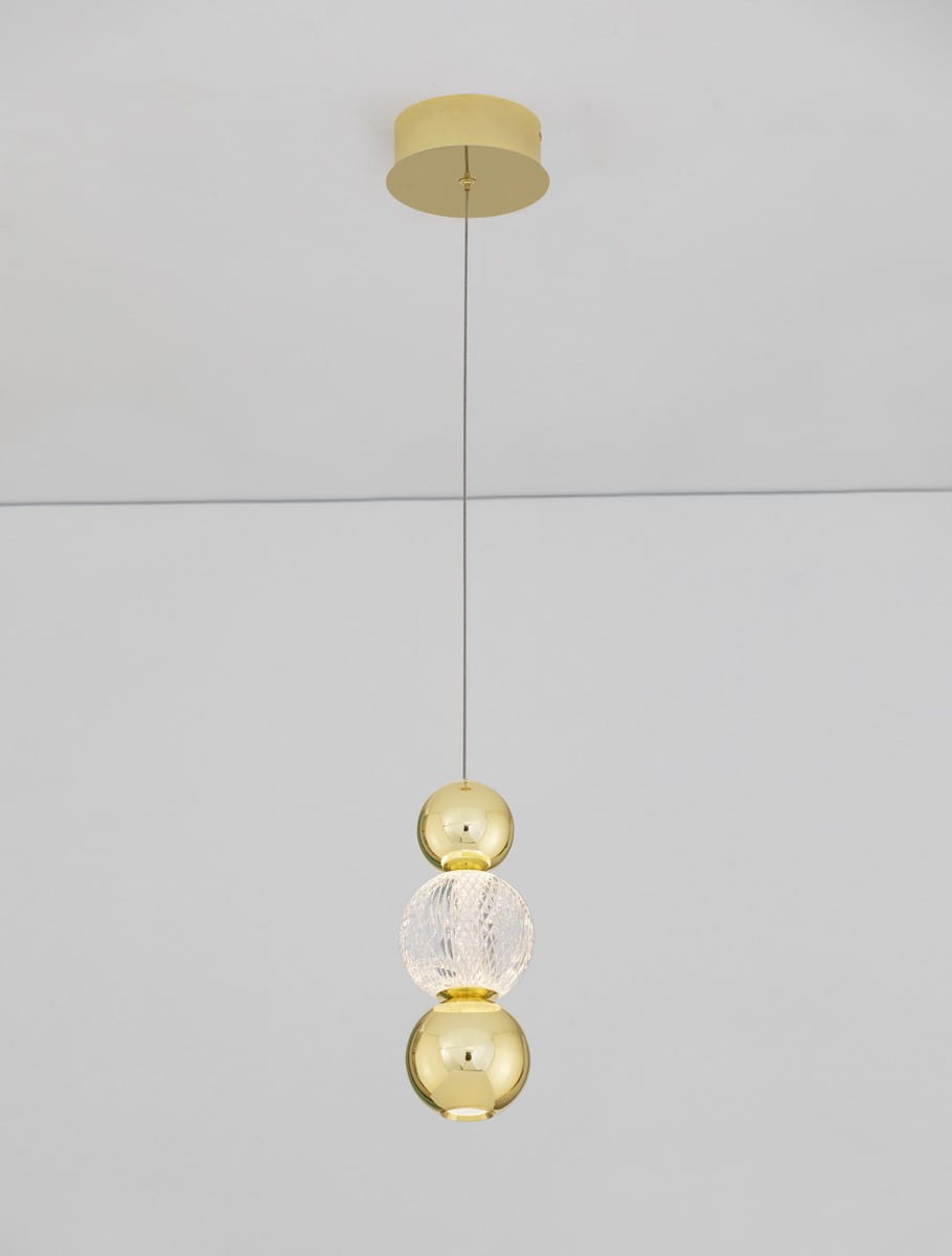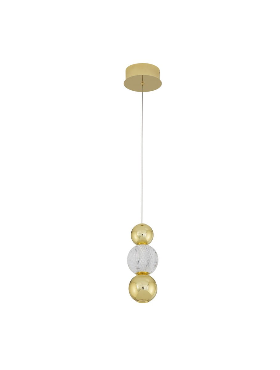 Lampa wisząca Ponce to subtelne piekno ujęte w krągłych kształtach i złotych elementach, które wspólnie tworzą oryginalną kompozycję przypominającą biżuterię z nawleczonymi koralikami.