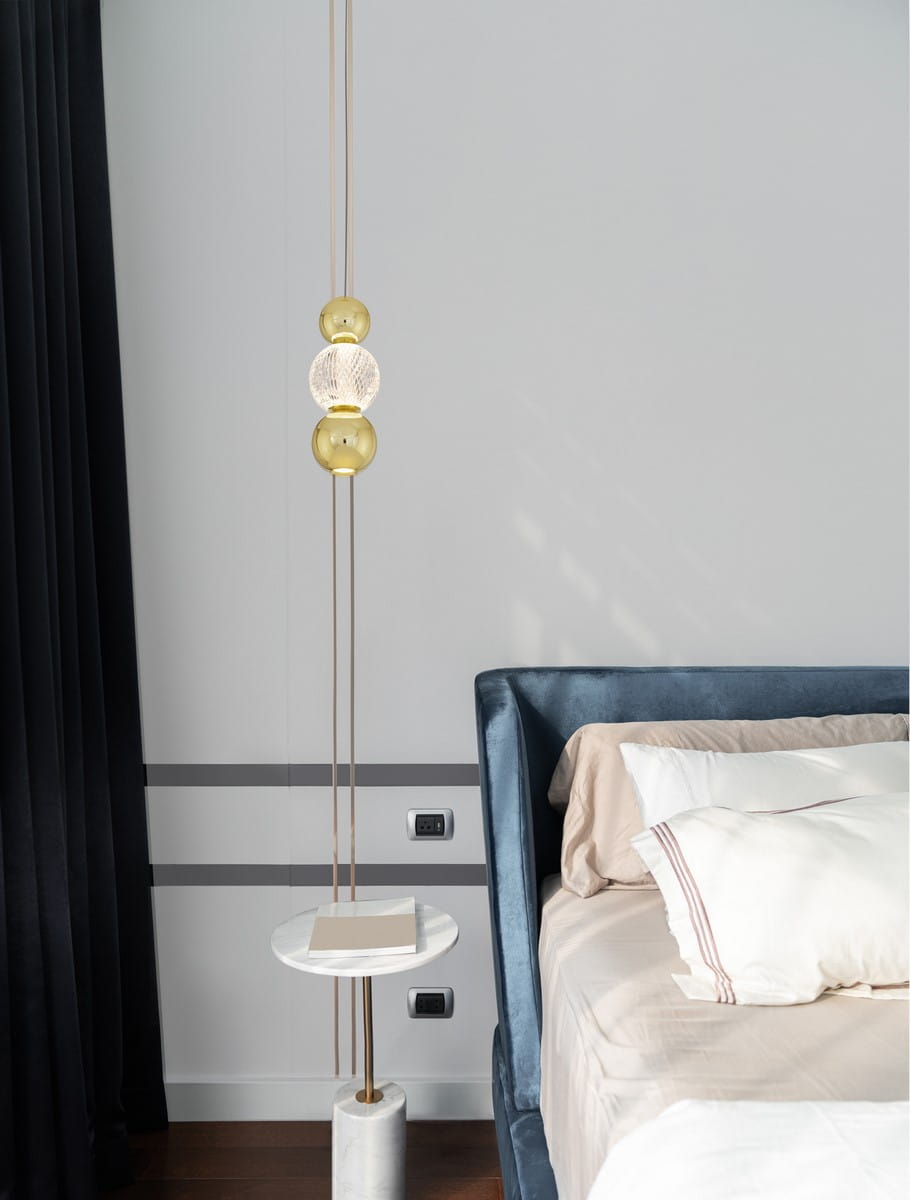 Lampa wisząca Ponce triple składa się z klosza mającego formę ciągu trzech, połączonych ze sobą kul. Kule nawleczone są na linkę niczym koraliki, gdzie metalowe kule w złotym kolorze przeplatają się z szklanymi, tworząc dynamiczną i nowoczesną kompozycję.