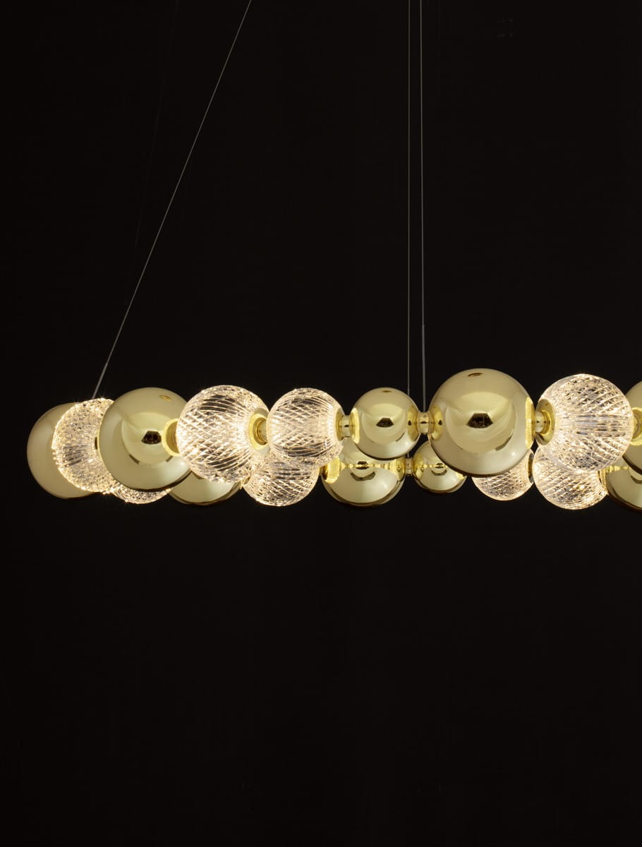 Lampa wisząca Ponce ma okrągła formę, składającą się z sekwencji metalowych i szklanych kul. Metalowe kule w złotym kolorze przeplatają się z transparentymi, które dodatkowo ozdobione są eleganckim ryflowaniem. Całość tworzy efektowną i nowoczesną kompozycję.