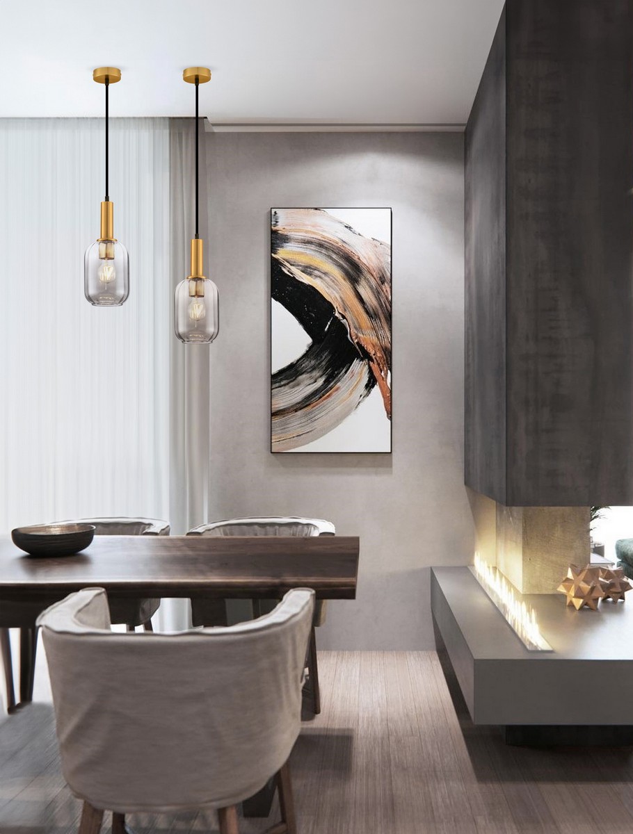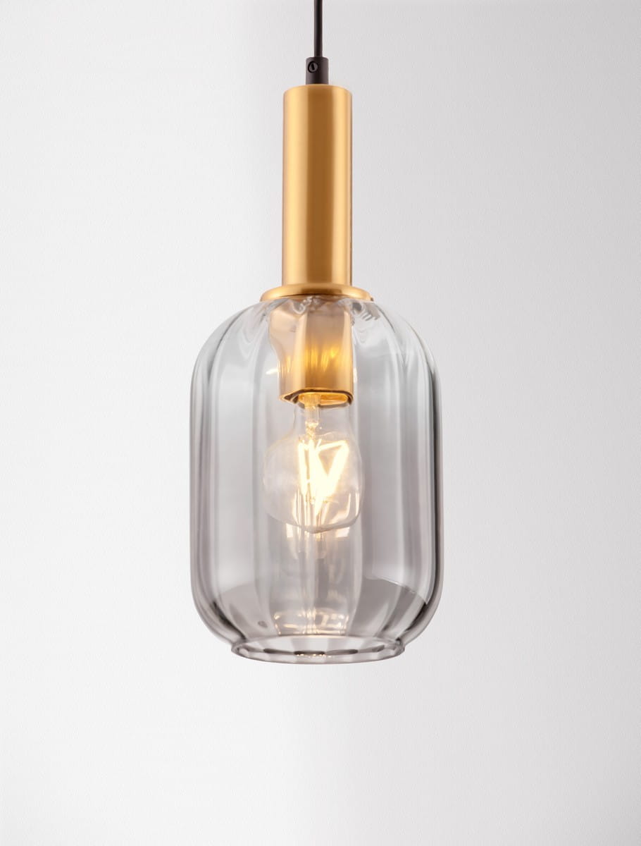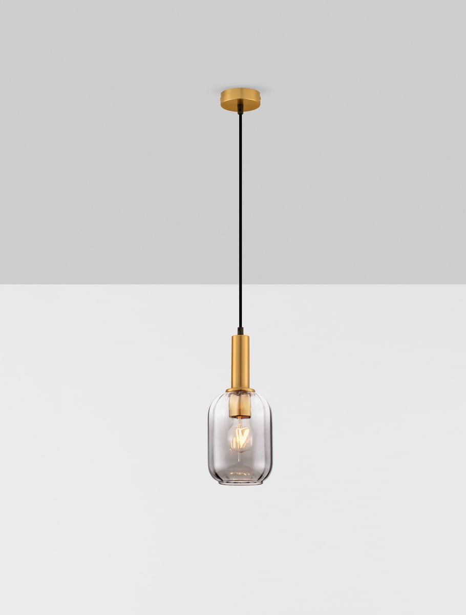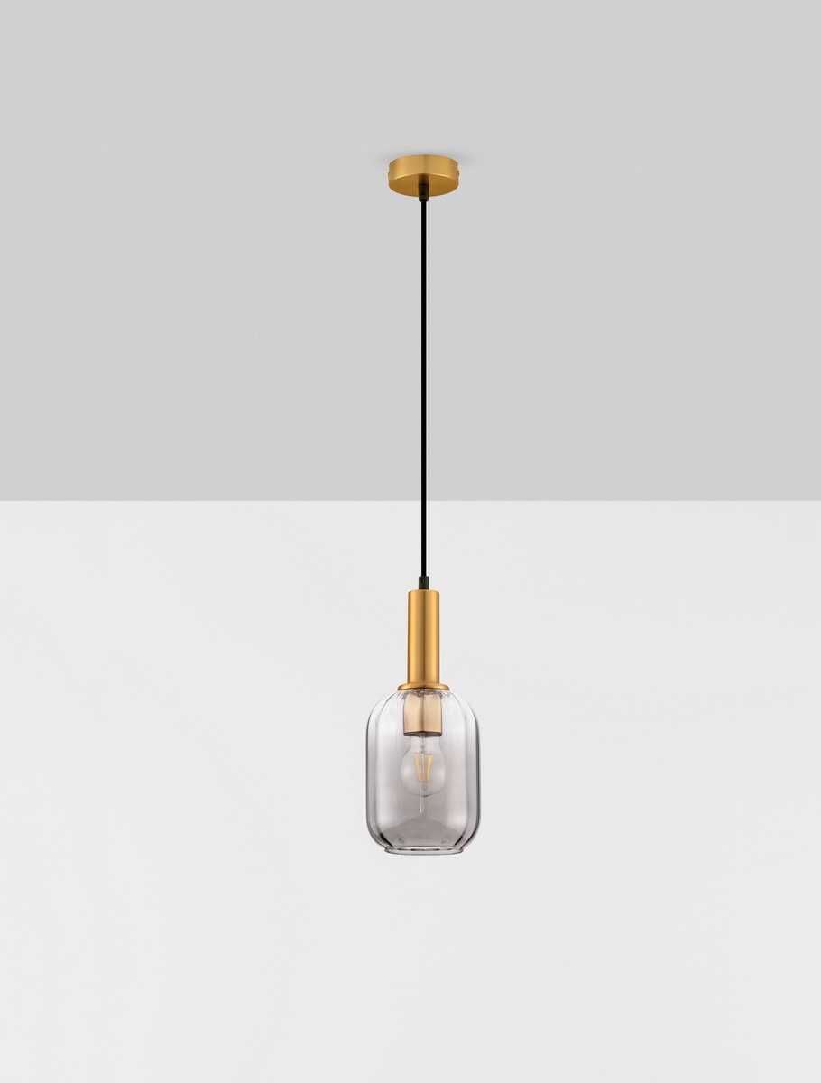 Model wyposażony jest w złotą, okrągłą podsufitkę, z której wychodzi smukły, czarny przewód prowadzący do dekoracyjnego klosza. Klosz wykonano z transparentnego, przydymionego szkła o delikatnie zaokrąglonym kształcie, które efektownie rozprasza światło, tworząc przytulny, nastrojowy klimat. Całość dopełnia złoty pierścień w górnej części klosza, nadający lampie wyrafinowanego, biżuteryjnego charakteru.