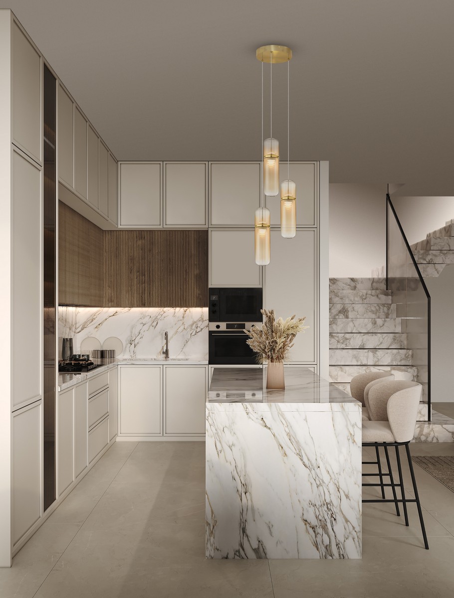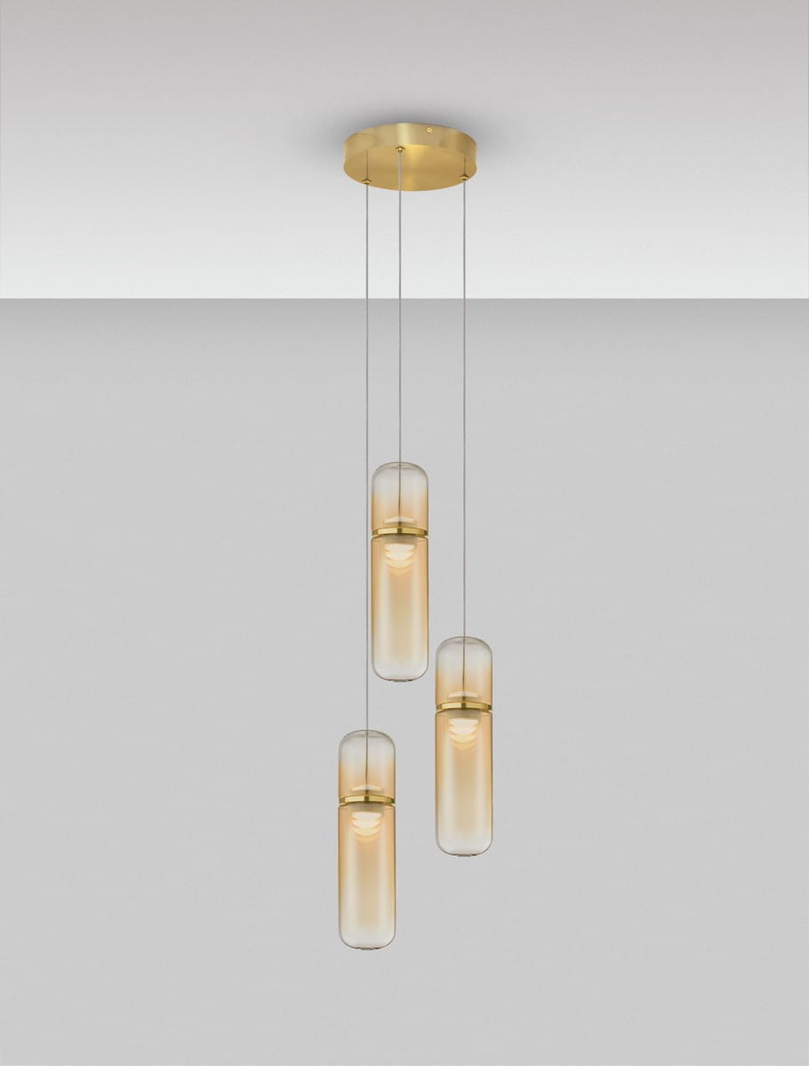 Lampa wisząca Rebalvo Disc-3 to wyrafinowana kompozycja trzech kloszy wykonanych z bursztynowego szkła, zawieszonych na różnych wysokościach na eleganckiej, złotej rozecie.