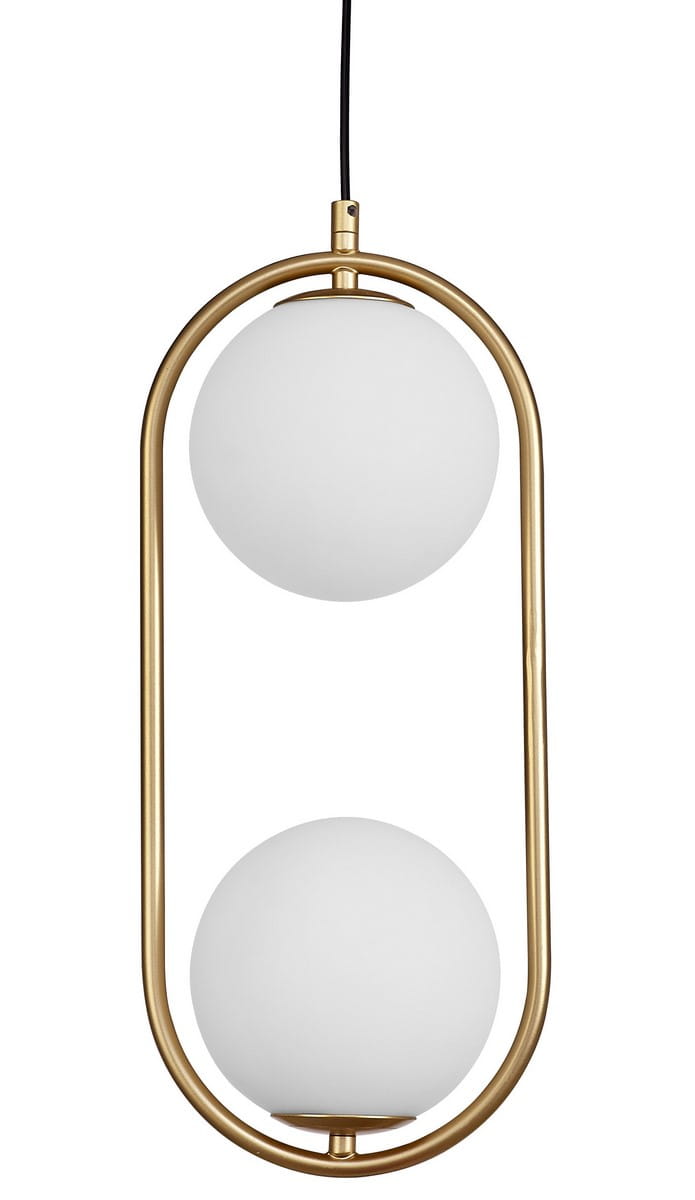 Lampa Rengo charakteryzuje się minimalistycznym kształtem złożonym z owalnej, metalowej ramy w kolorze złotym oraz dwóch szklanych kul w białym kolorze, umieszczonych na górze i na dole. Ten elegancki kontrast tworzy efektowny, nowoczesny wygląd, który przyciąga wzrok i nadaje wnętrzu wyjątkowego charakteru. Centralnym elementem lampy są szklane kule, które mieszcza w sobie żarówki. Lampa zapewnia jasne i ciepłe oświetlenie, idealne do codziennego użytku.