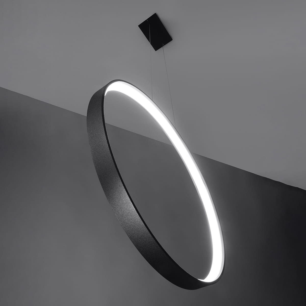 Lampę charakteryzuje kształt w formie czarnego ringu, zwisającego pionowo na smukłych linkach.