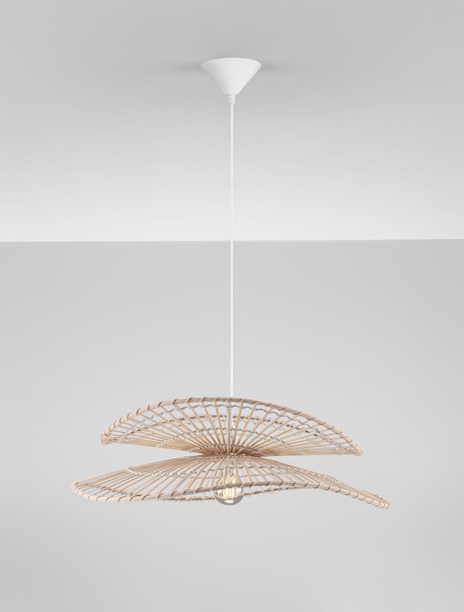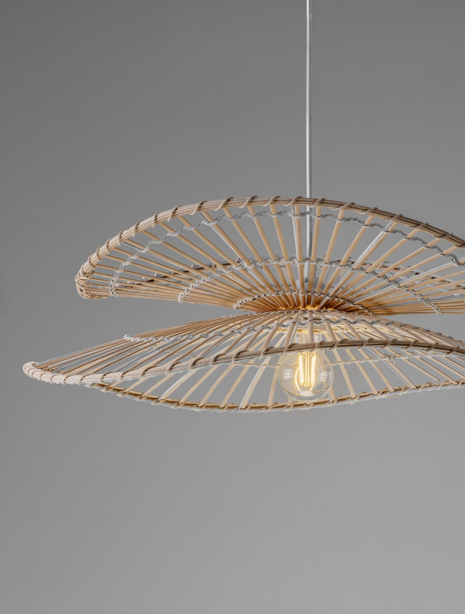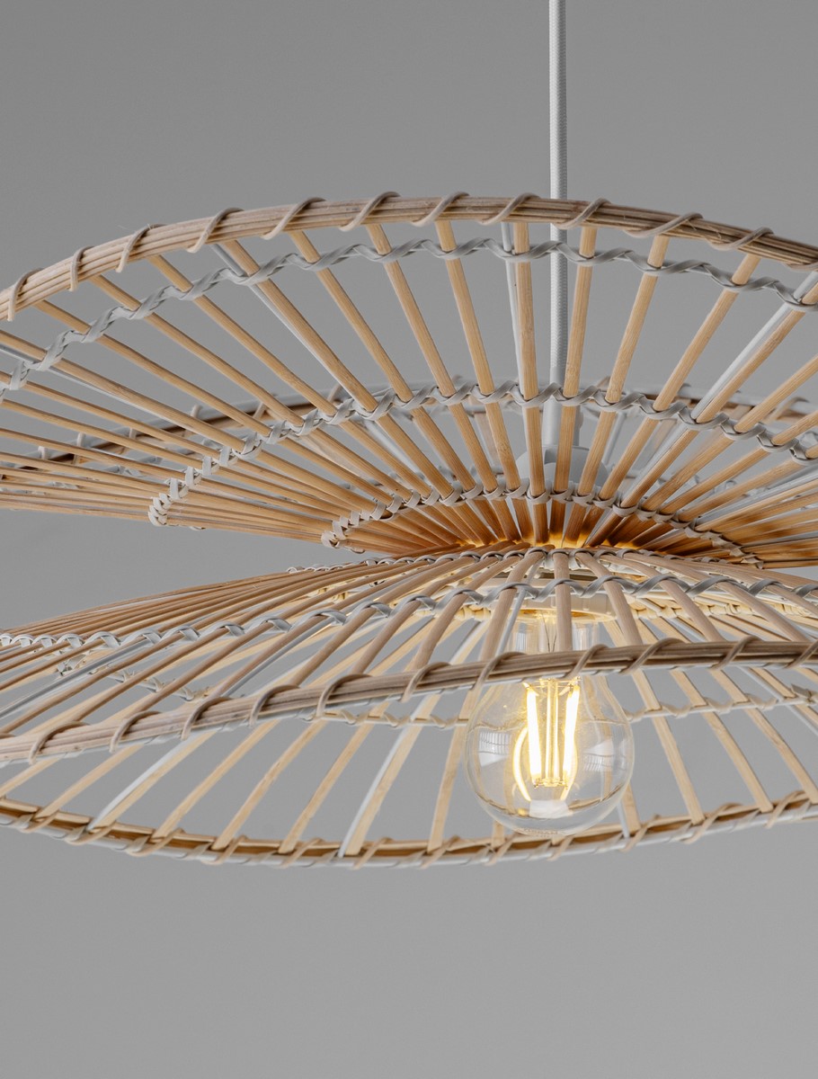 Lampa wisząca Selvora to harmonijne połączenie naturalnych materiałów i nowoczesnego wzornictwa, które nadaje wnętrzu niepowtarzalny klimat. Wykonana z rattanu, bambusa i stali, zachwyca lekką, ażurową konstrukcją oraz dynamiczną, dwupoziomową formą klosza. Jej kształt subtelnie otacza źródło światła, rozpraszając je w sposób delikatny i przyjemny dla oka.