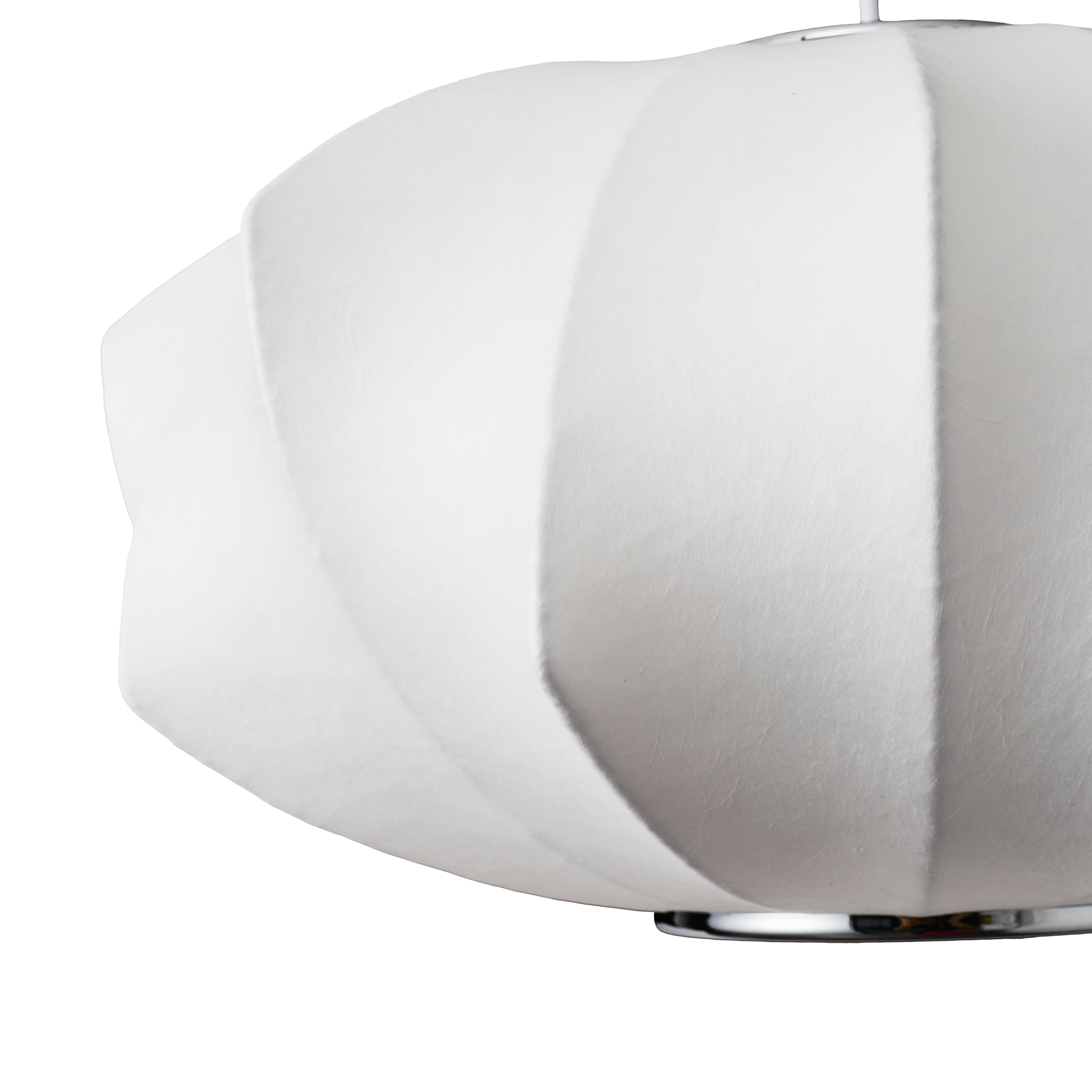 Lampa wisząca SILK V-shape to wyraz subtelnego designu inspirowanego stylem skandynawskim oraz japandi. Jej wyjątkowa, organiczna forma oparta jest na delikatnych załamaniach przypominających kształt kwiatu lub muszli. Klosz wykonany z miękkiej, tekstylnej tkaniny subtelnie rozprasza światło, tworząc ciepłą, nastrojową atmosferę w pomieszczeniu.