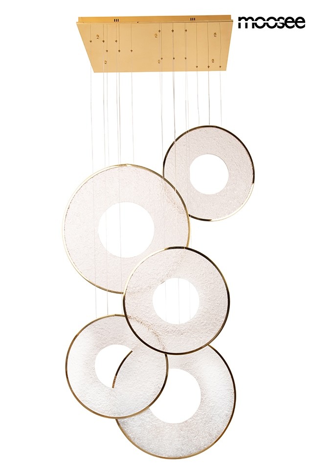 Lampa wisząca STARDUST to zachwycająca kompozycja światła i formy, która wnosi do wnętrza wyjątkową lekkość oraz elegancki charakter. Transparentne obręcze o subtelnej, strukturalnej powierzchni zostały zawieszone w złocistej ramie wykonanej ze stali, tworząc efektowną, a zarazem harmonijną całość.