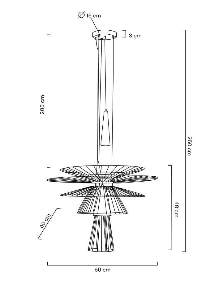 Lampa Sesto to prawdziwe dzieło sztuki oświetleniowej, której kompozycja składa się z metalowych drutów ułożonych kaskadowo. Klosz tworzą obszerne okręgi i stożki układające się w geometryczną konstrukcję. Dwa źródła światła, skierowane w dół, tworzą niepowtarzalny efekt wizualny, w którym oświetlenie z górnego źródła odbija się od płaskiego okręgu w środku oprawy, rozpraszając strumień światła i tworząc magiczną, subtelną aurę.