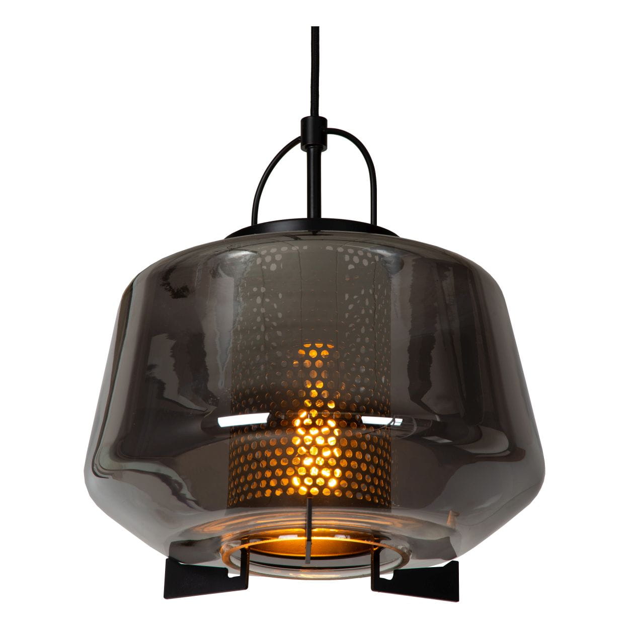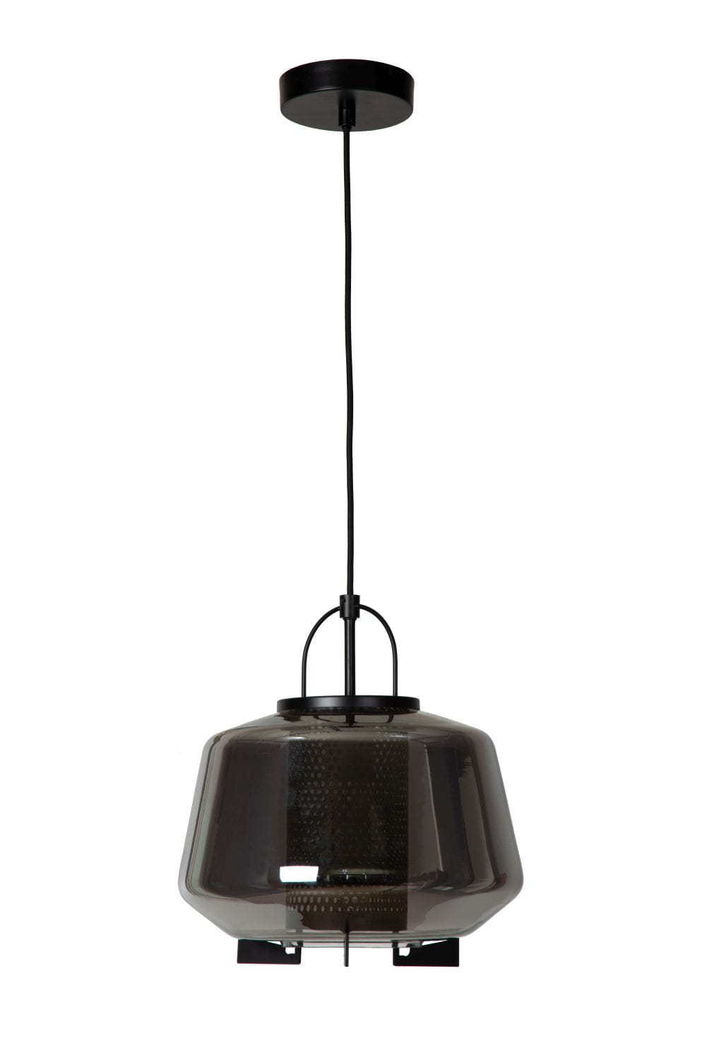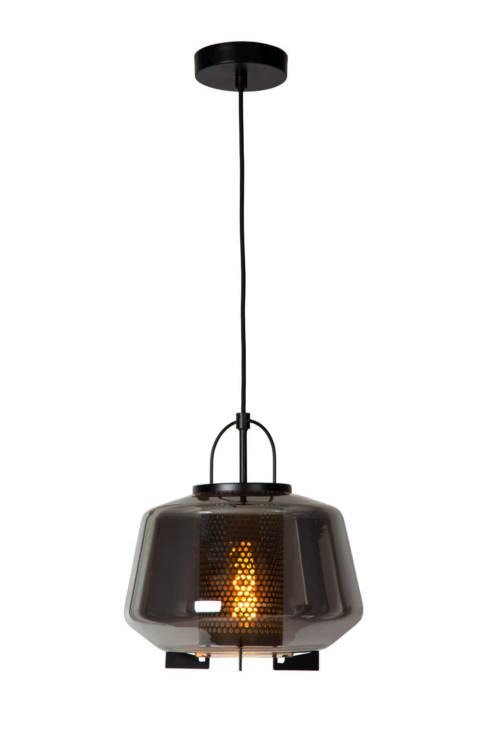 Klosz lampy wykonany został z wysokiej jakości szkła o dymnym wykończeniu, który w swoim wnętrzu skrywa ażurową osłonkę, przez którą przebijają się promienie świetlne. Całość utrzymuje metalowa podsufitka wraz z tekstylnym kablem i metalowym stelażem. Otwór u podstawy klosza doskonale kieruje źródło światła w dół, przez co bez problemu oświetlimy wybraną przestrzeń. Z użyciem ściemnialnej żarówki w łatwy sposób dostosujemy jasność światła według własnego uznania i nadamy wnętrzu wyjątkowy klimat. Dzięki regulacji wysokości możemy dowolnie obniżać i podwyższać poziom oświetlenia.