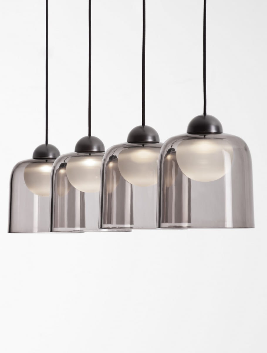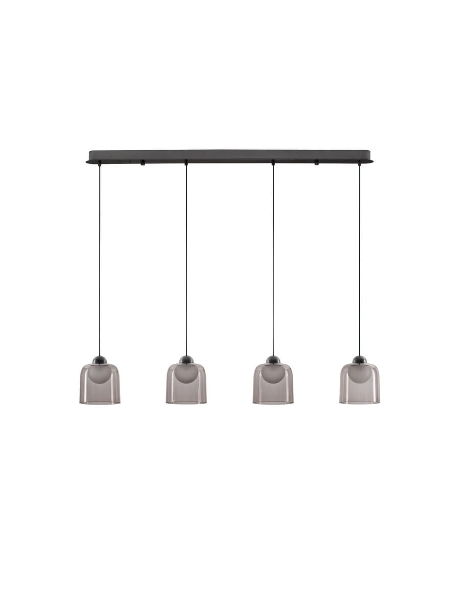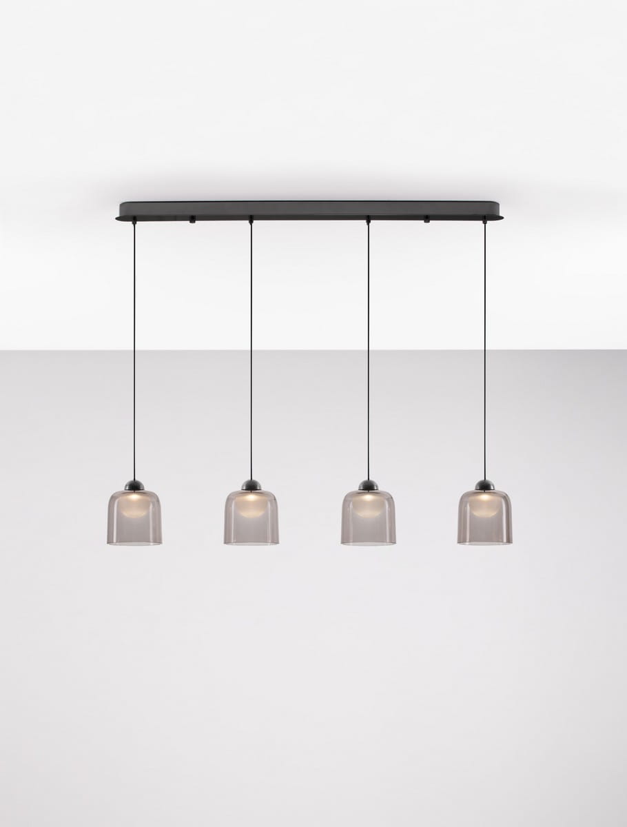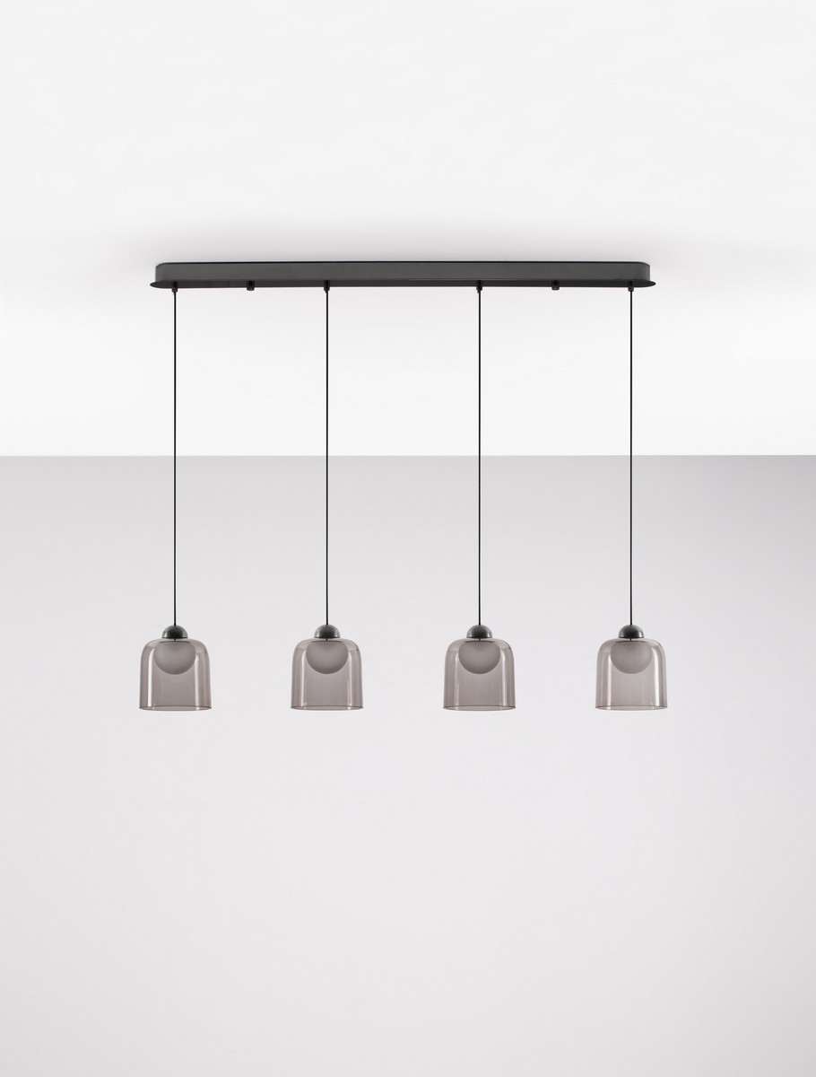 Cztery klosze wykonany z dymionego szkła w subtelnym odcieniu różu, zostały zawieszone w liniowej kompozycji. Ten unikalny efekt kolorystyczny pięknie współgra z czarnym wykończeniem pozostałych elementów, tworząc spójną i stylową kompozycję.
