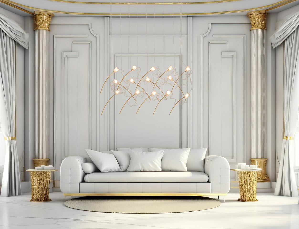 Między kloszami znajduje się ozdobna linka w złotym odcieniu, przypominająca splątane między kwiatami źdźbła trawy.