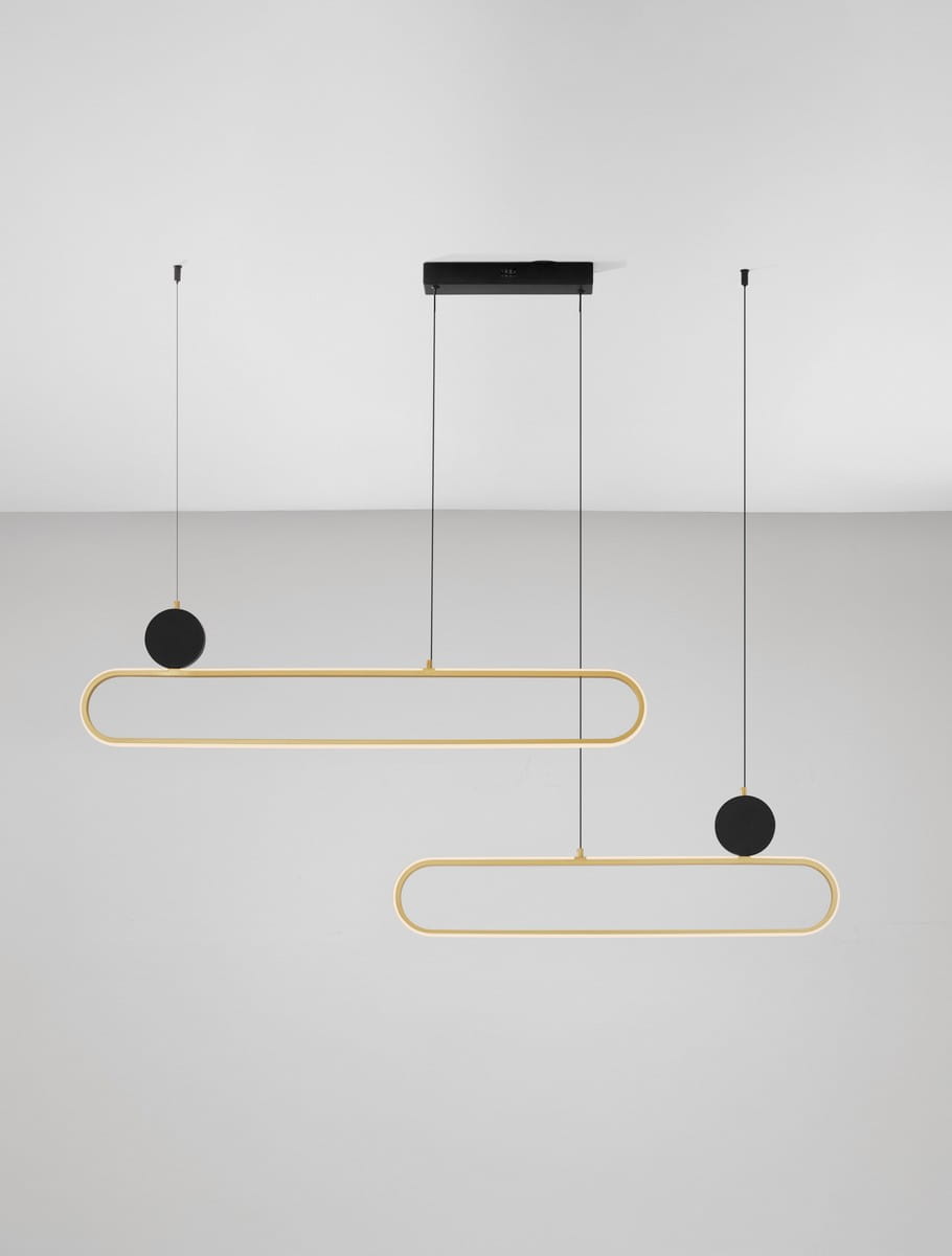 Turviano to wyjątkowa lampa wisząca, która łączy nowoczesną elegancję z wyrazistą formą i perfekcyjnym wykończeniem. Jej konstrukcja opiera się na dwóch owalnych, smukłych ramionach świetlnych wykonanych z aluminium, stali i akrylu, które zawieszone są na niemal niewidocznych, delikatnych przewodach. Ich subtelna linia zdaje się unosić w powietrzu, tworząc efekt lekkości i wizualnej harmonii.