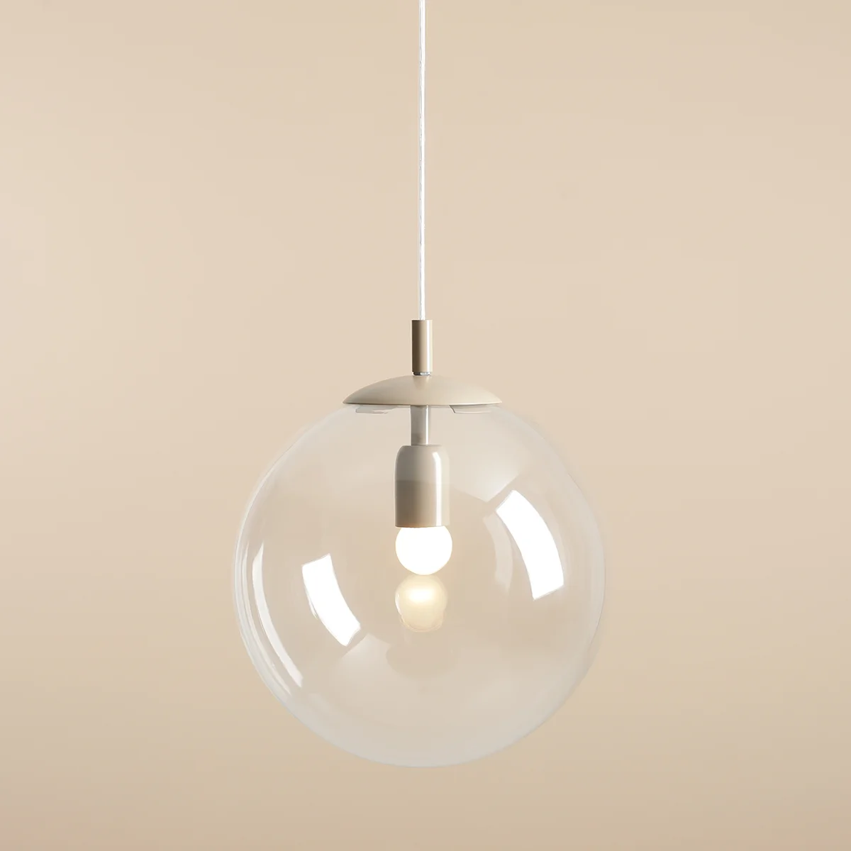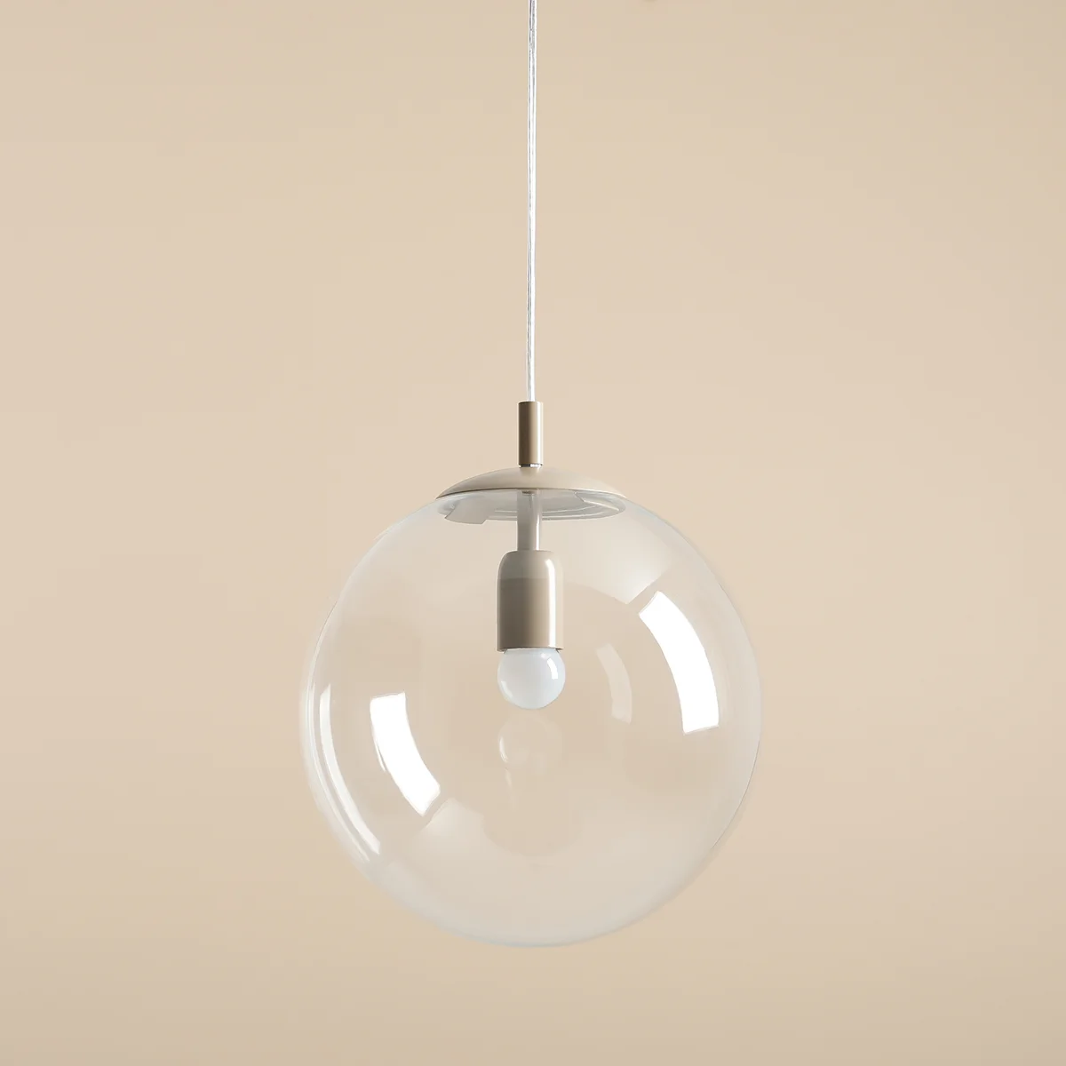 Kulista lampa wisząca z transparentnym, szklanym kloszem i metalowymi elementami w kolorze beżu.