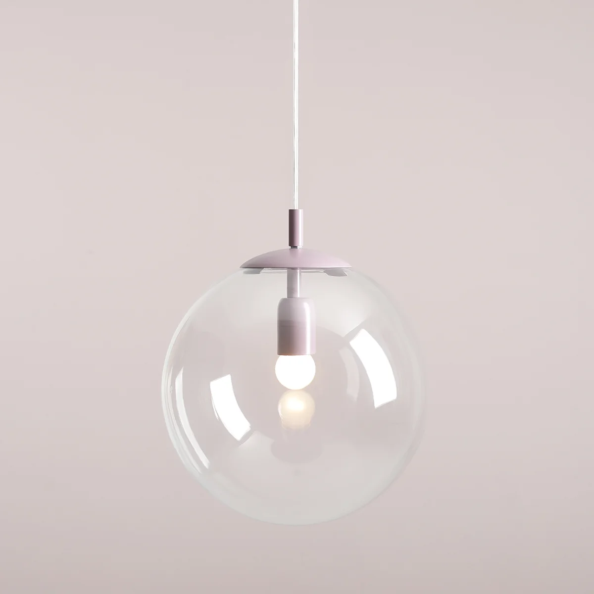 Kulista lampa wisząca z transparentnym, szklanym kloszem i metalowymi elementami w kolorze lawendowym.