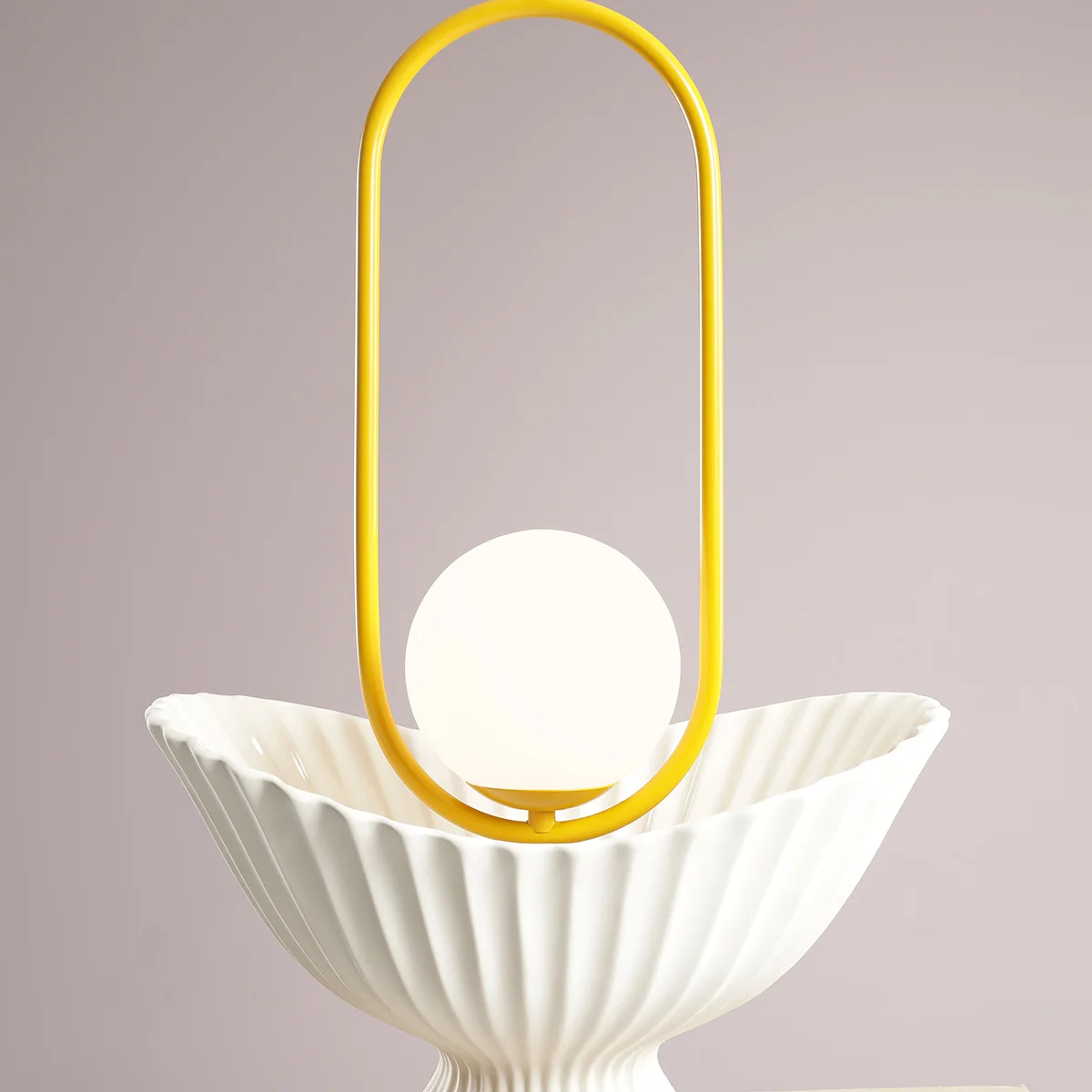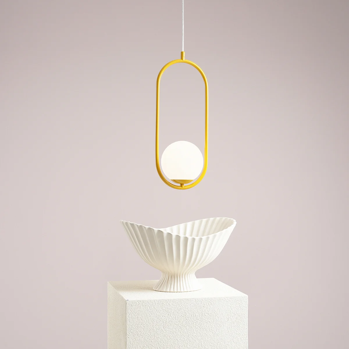 Żółta lampa wisząca z kloszem kulą zapewnia miękkie i przyjemne oświetlenie.