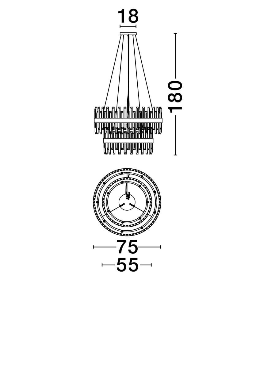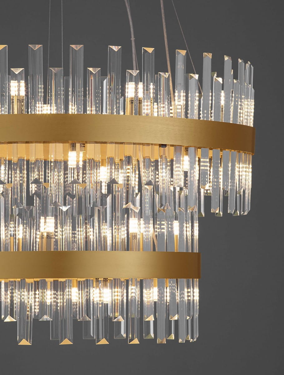 Konstrukcja lampy wyróżnia się kaskadowym rozmieszczeniem kloszy, które tworzą efektowny układ warstw. Klosz składa się z dwóch metalowych obręczy w kolorze złota, na których osadzone zostały transparentne kryształowe elementy. Gładka, lekko połyskująca powierzchnia metalu harmonijnie współgra z kryształowymi detalami, tworząc wrażenie lekkości i elegancji.