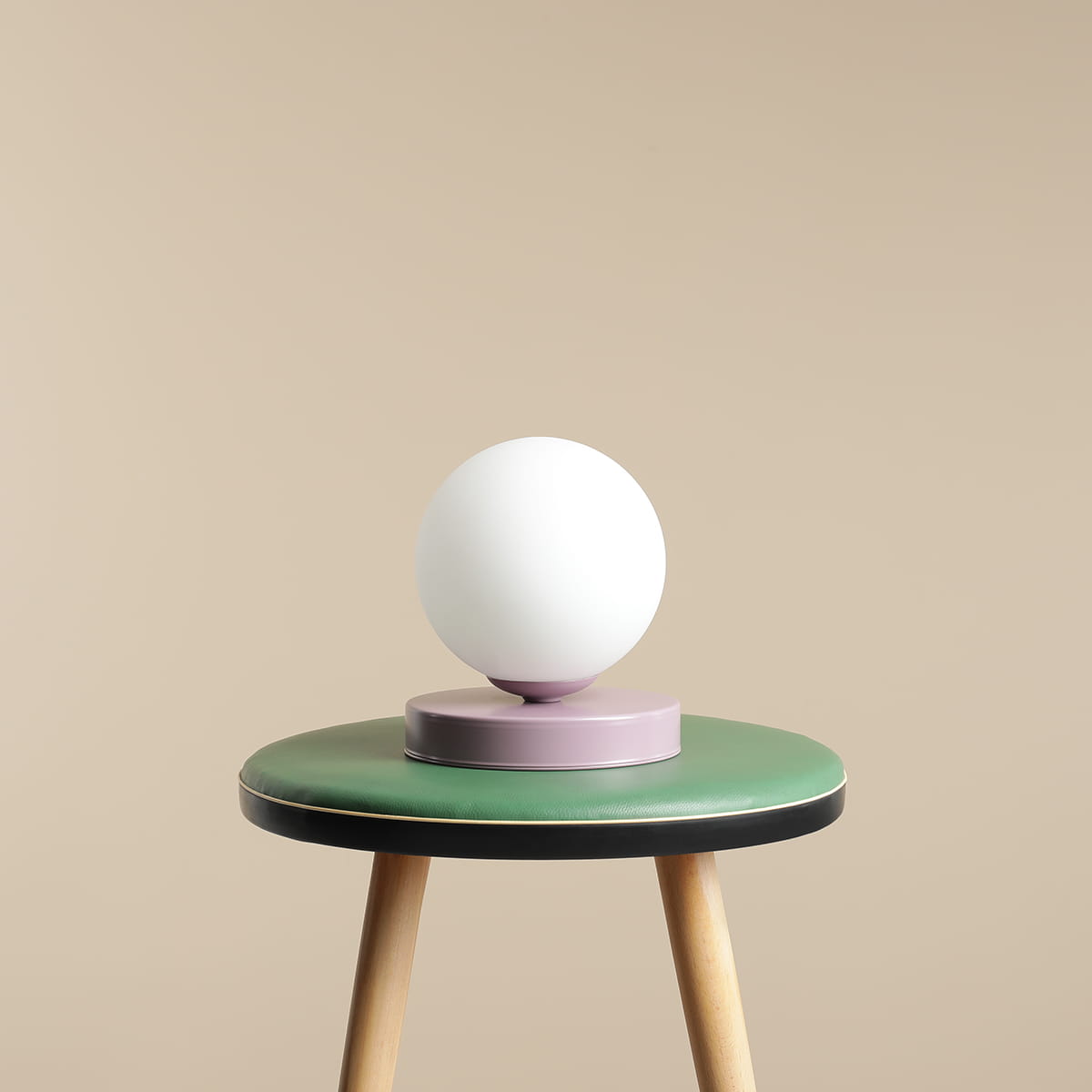 Lampa stołowa Ball w kształcie białej kuli z podstawą w kolorze lilak - delikatnego, wrzosowego fioletu. Idealna na stolik nocny, parapet, półkę czy podłogę - nastrojowo oświetli wnętrze i zarazem stanie się minimalistycznym elementem dekoracyjnym.