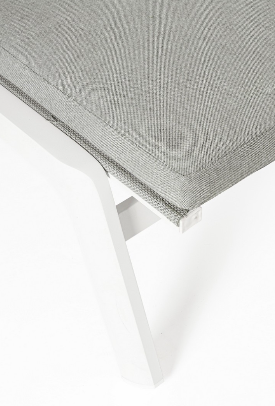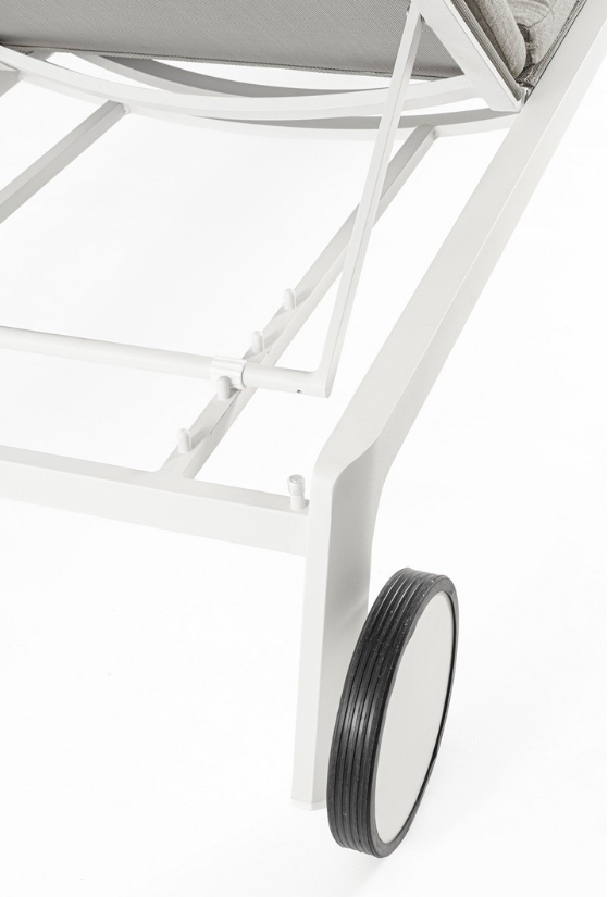 Bazę leżyska stanowi elastyczna i wysoce odporna na rozciąganie tkanina Textilene (splot 2x2), która świetnie dopasowuje się do ciała i zapewnia przyjemną cyrkulację powietrza w upalne dni. Na niej spoczywa wygodna poduszka na całej długości mebla, obszyta zaawansowanym, wodoodpornym materiałem akrylowym w idealnie dopasowanym, jasnym kolorze. Pokrowiec wyposażono w dyskretny zamek błyskawiczny, co pozwala na jego szybkie zdjęcie i wypranie po letnim sezonie.