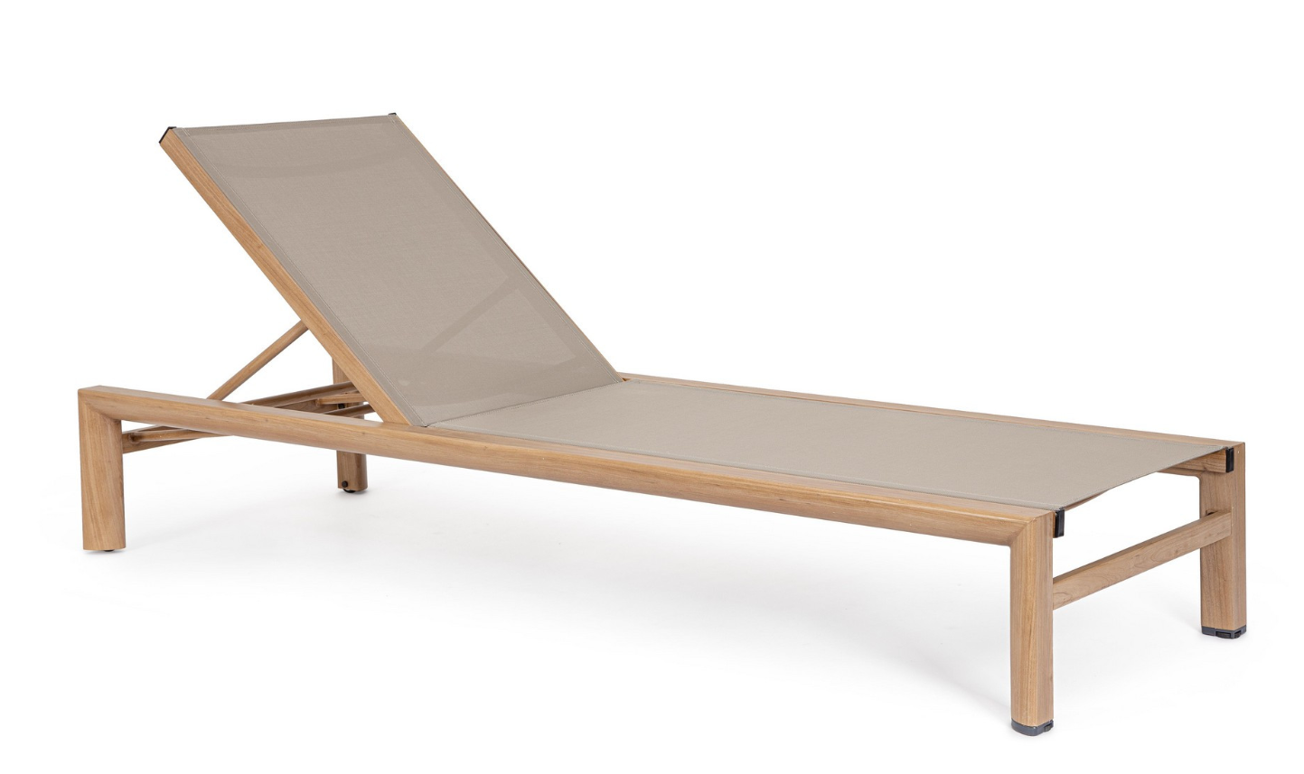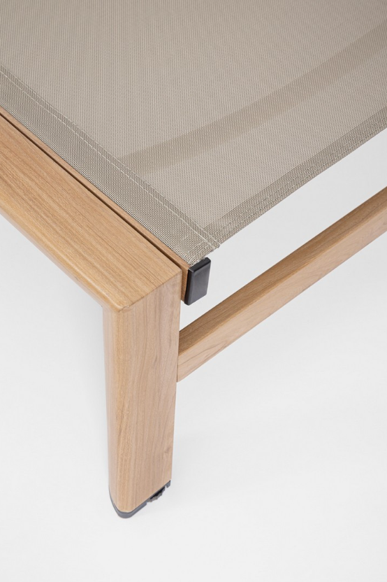 Siedzisko i oparcie wykonane są z przewiewnego materiału textilene (2x1) w naturalnym odcieniu, który zapewnia komfort użytkowania nawet w upalne dni. Regulowane oparcie z czterema pozycjami pozwala dopasować kąt nachylenia do własnych potrzeb — zarówno do opalania, jak i czytania czy drzemki.