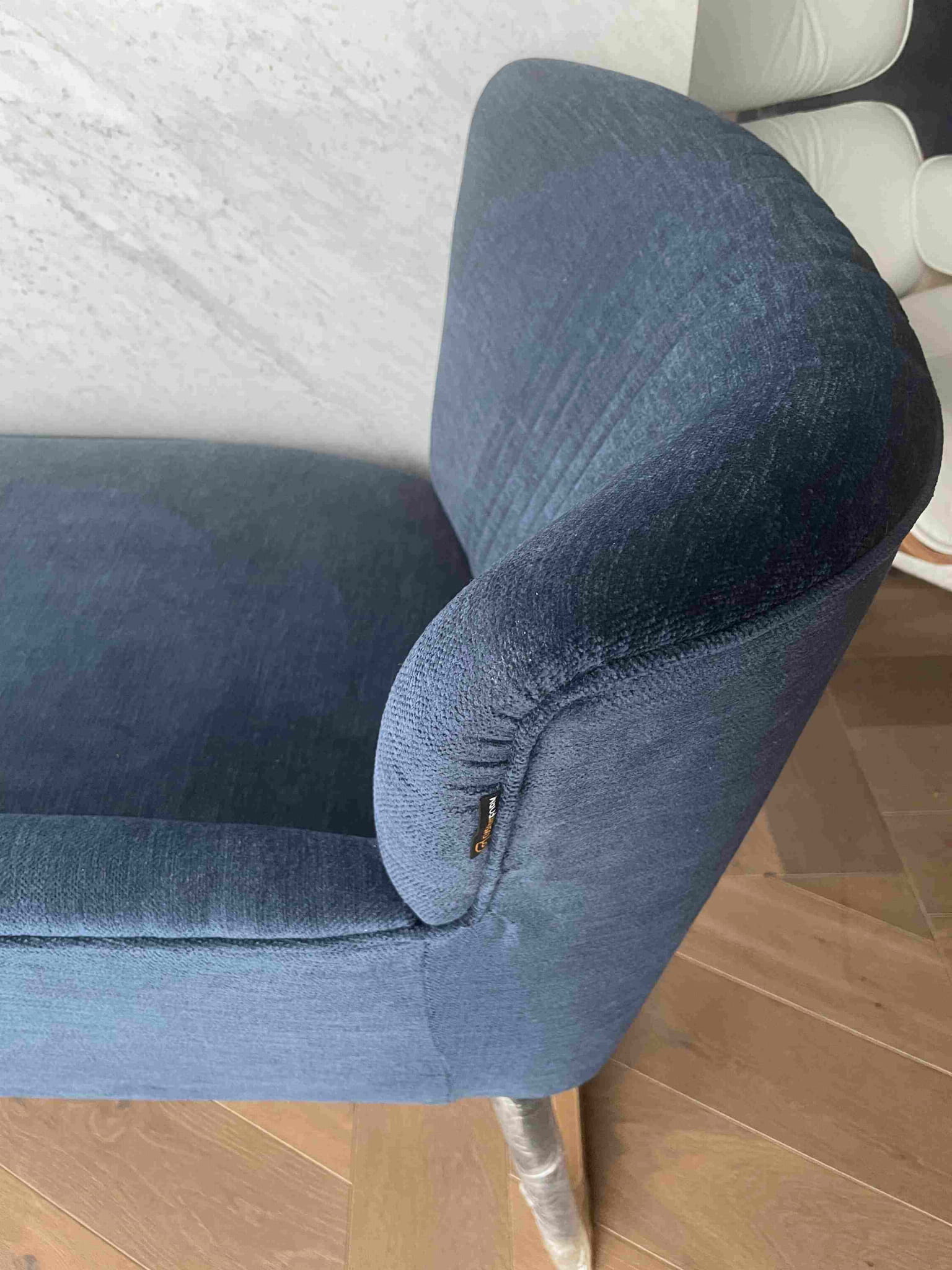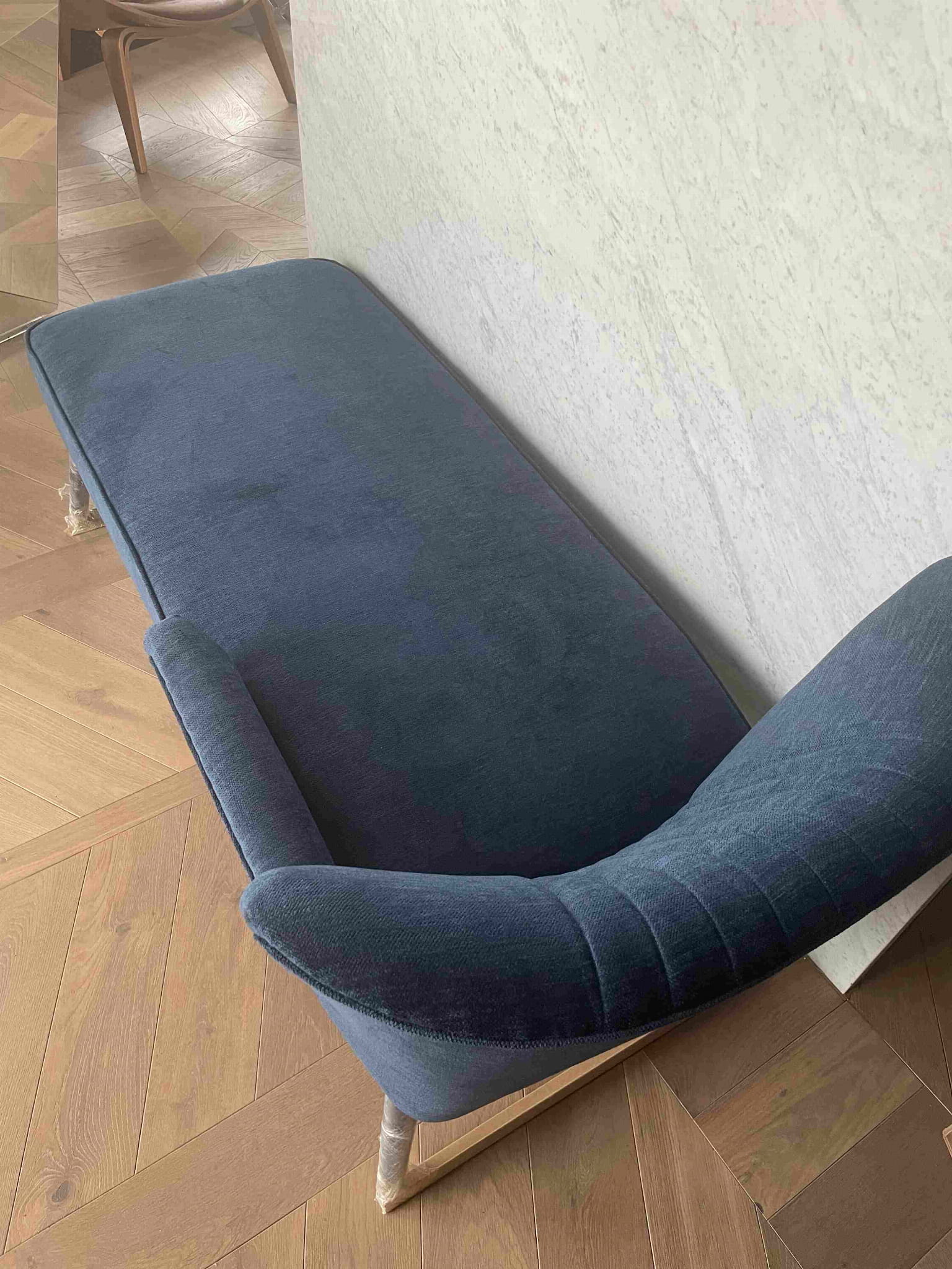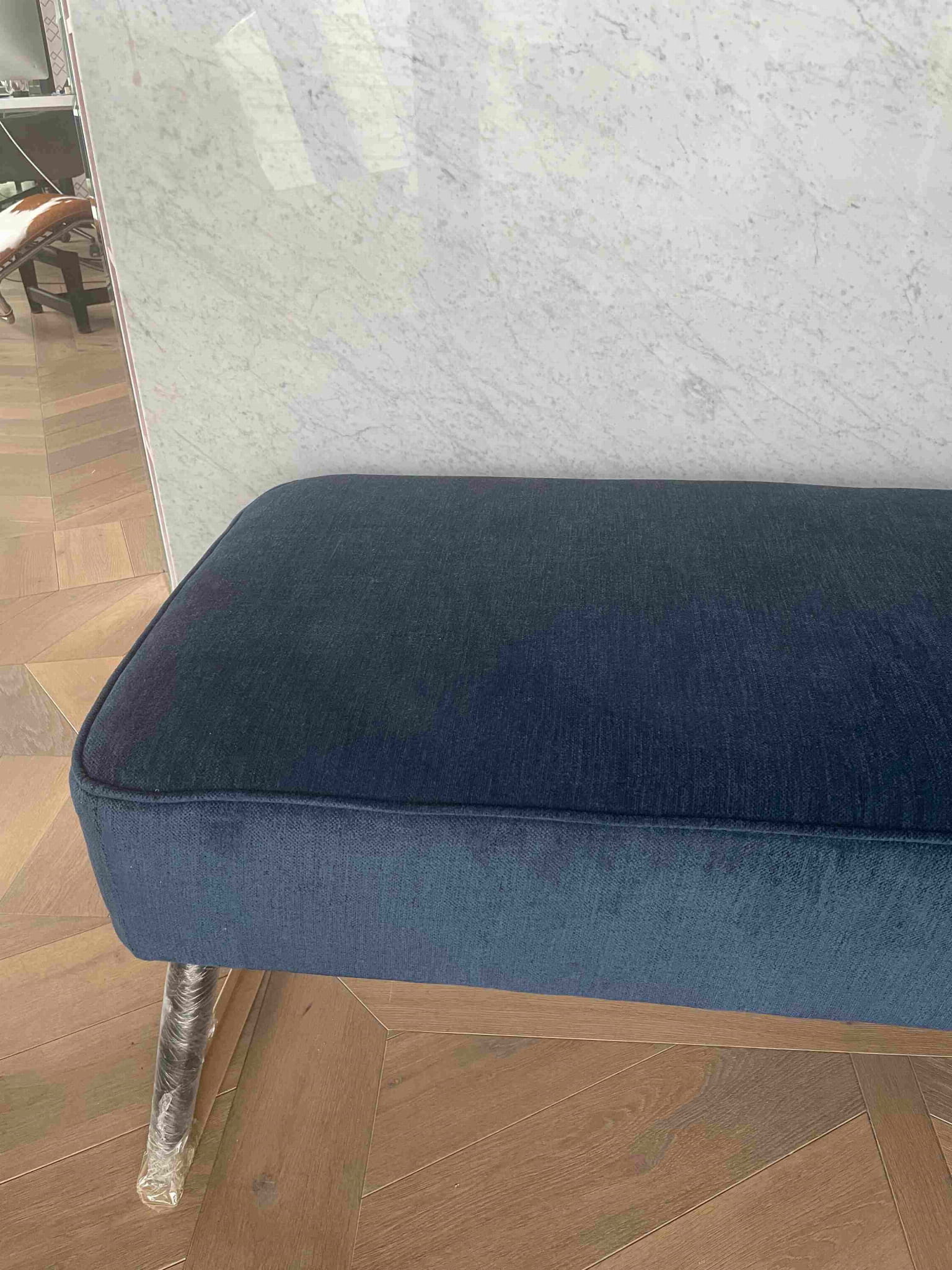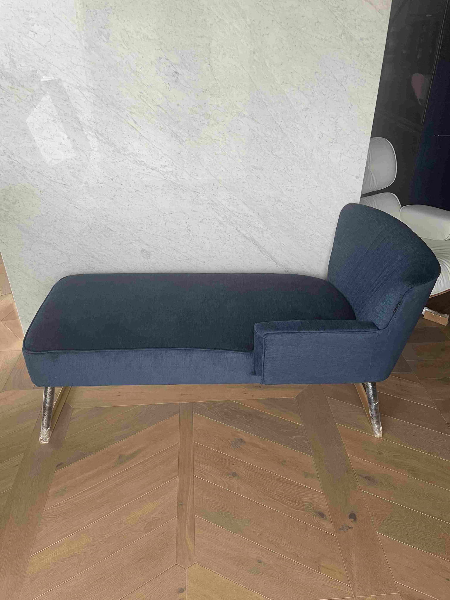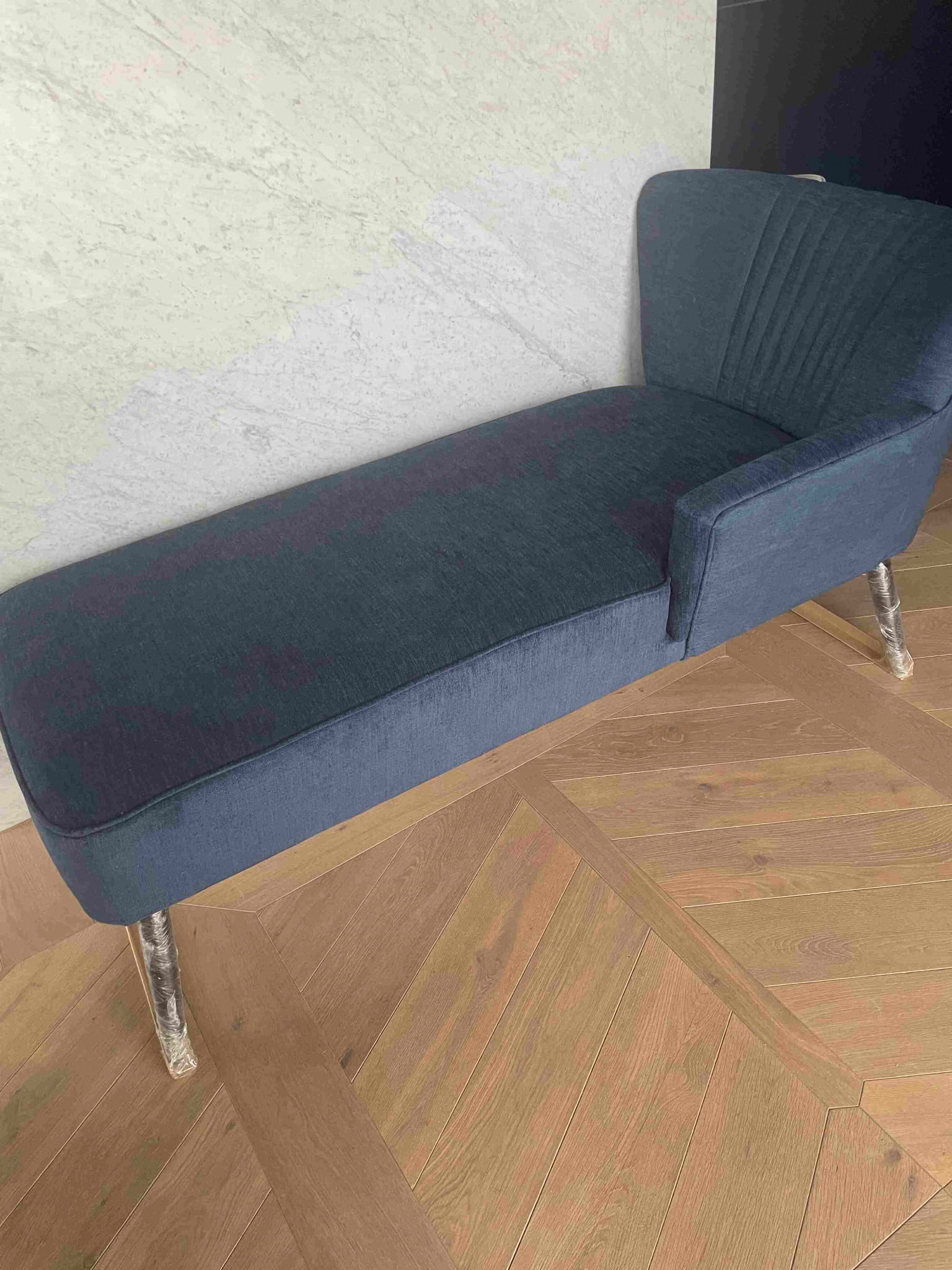 Leżanka na prezentowanych zdjęciach jest tapicerowana tkaniną OL19 jeżyna. Jest to szeniolowa tkanina w kolorze eleganckiego granatu z III grupy cenowej. Nóżki - kolor czarny. Dostępna 1 szt.