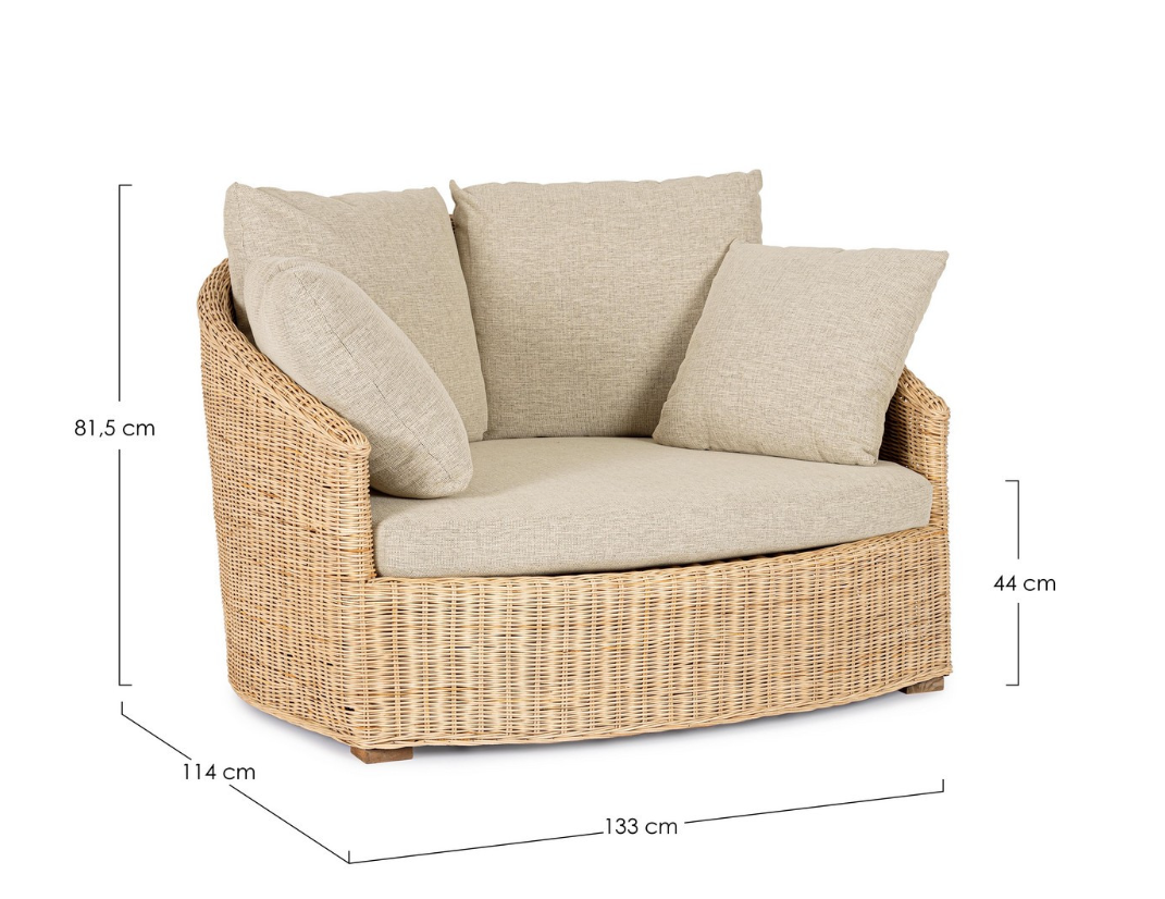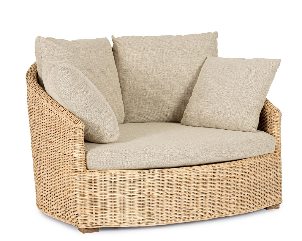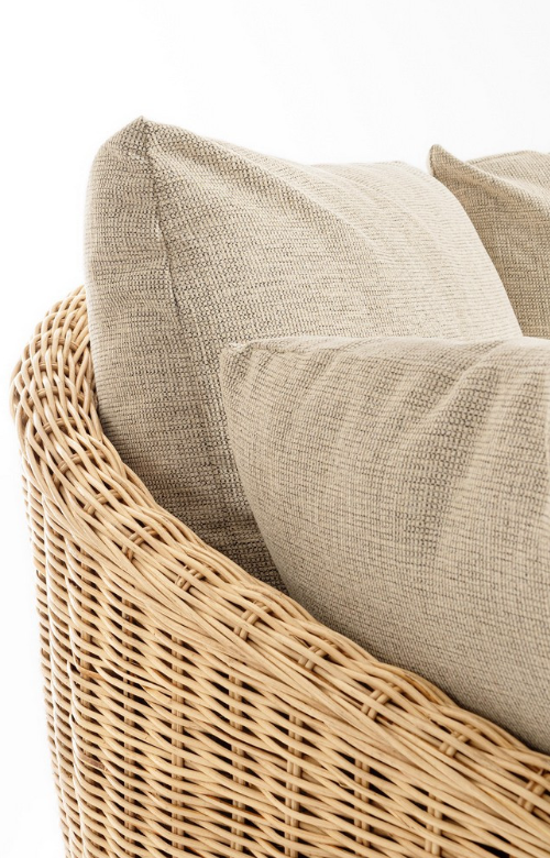 Obszerny, zaokrąglony kształt mebla o głębokości aż 114 cm stwarza idealne warunki do wypoczynku. Za niezwykły komfort użytkowania odpowiada bardzo gruba poduszka na siedzisku oraz zestaw miękkich poduszek oparciowych, które szczelnie wypełniają przestrzeń leżanki. Jasna, beżowa tkanina doskonale komponuje się z naturalnym odcieniem rattanu. Poszewki wyposażono w praktyczny system zdejmowania, co znacząco ułatwia utrzymanie ich w nienagannej czystości.