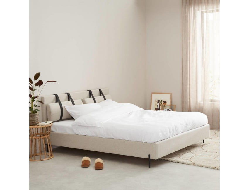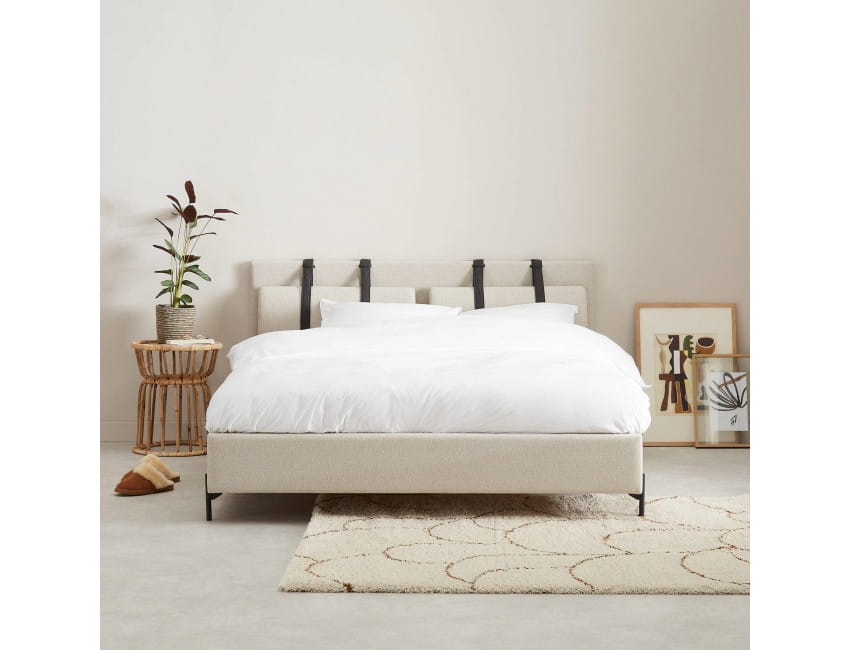 Beżowe, tapicerowane łóżko z komfortowym zagłówkiem.
