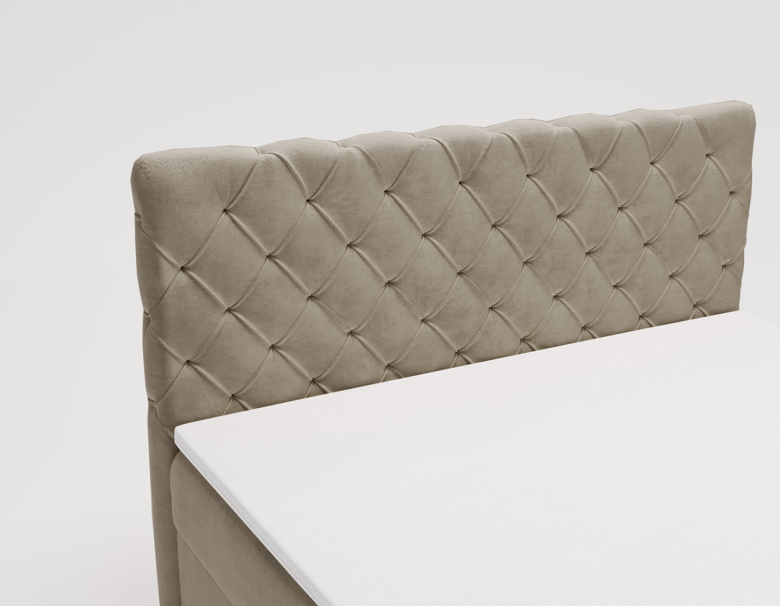 Łóżko zostało obite wyjątkowo miękką tkaniną Elegance 5, o welurowej strukturze, która zachwyca subtelnym połyskiem i przyjemnością w dotyku. Materiał ten nie tylko dodaje całości elegancji, ale także jest trwały i odporny na codzienne użytkowanie, dzięki czemu łóżko przez lata zachowuje swój nienaganny wygląd.