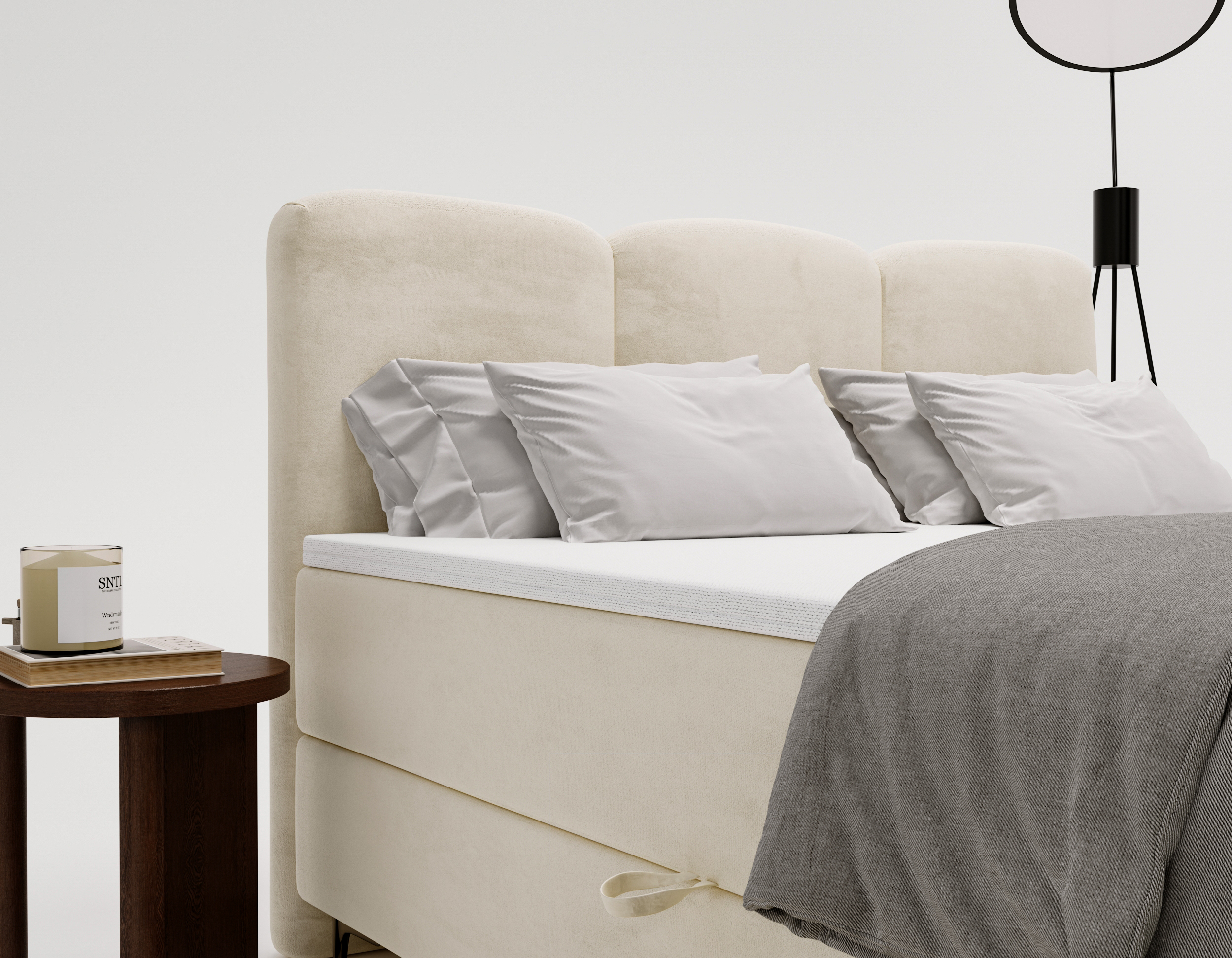 Łóżko kontynentalne Roll to elegancka propozycja dla osób, które cenią nowoczesny design, komfort i praktyczne rozwiązania. Wyróżnia się charakterystycznym, zaokrąglonym zagłówkiem z trzema miękkimi panelami, które tworzą przytulną, harmonijną formę. Subtelna linia i proporcje sprawiają, że Roll świetnie wpisuje się w wystrój każdej sypialni – od minimalistycznych po klasyczne aranżacje.