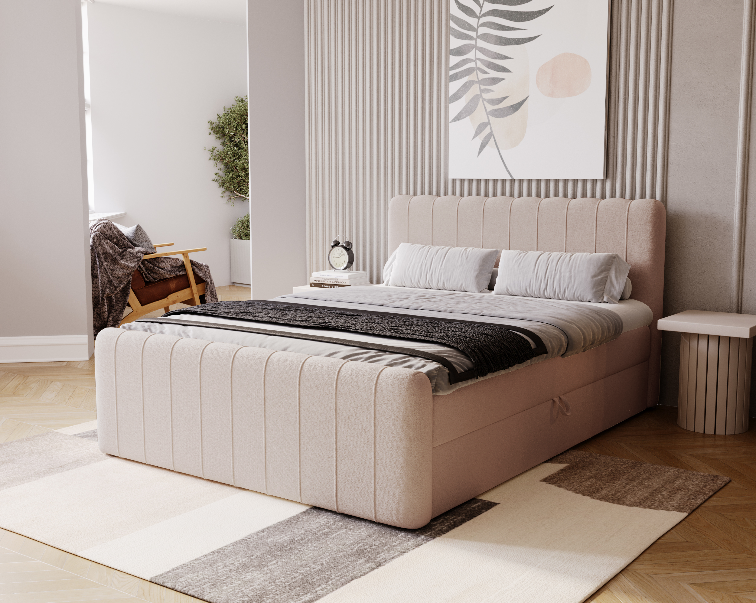 Łóżko kontynentalne Simple to kwintesencja nowoczesnej elegancji i funkcjonalności. Jego ponadczasowy design opiera się na prostych, harmonijnych liniach, które wprowadzają do wnętrza spokój i porządek. Charakterystyczne pionowe przeszycia na zagłówku i przednim panelu nadają całości subtelny rytm, a miękkie zaokrąglenia boków i krawędzi dodają bryle lekkości i przytulności.
