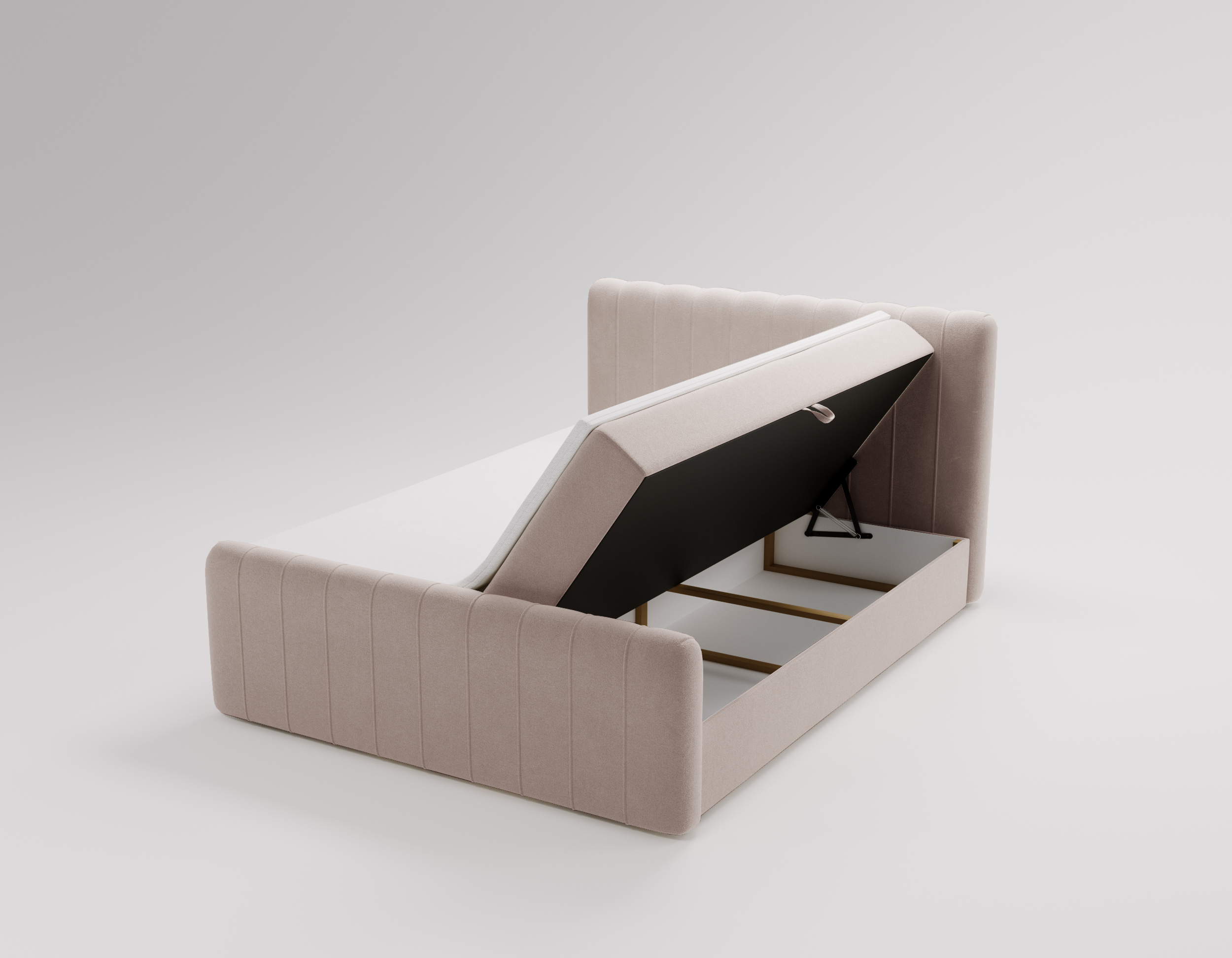 Łóżko Simple wyposażone jest w pojemny schowek na pościel otwierany przy pomocy wygodnego mechanizmu, który umożliwia łatwe i ciche podnoszenie. To praktyczne rozwiązanie, które pozwala w pełni wykorzystać przestrzeń w sypialni, zachowując jej elegancki wygląd.