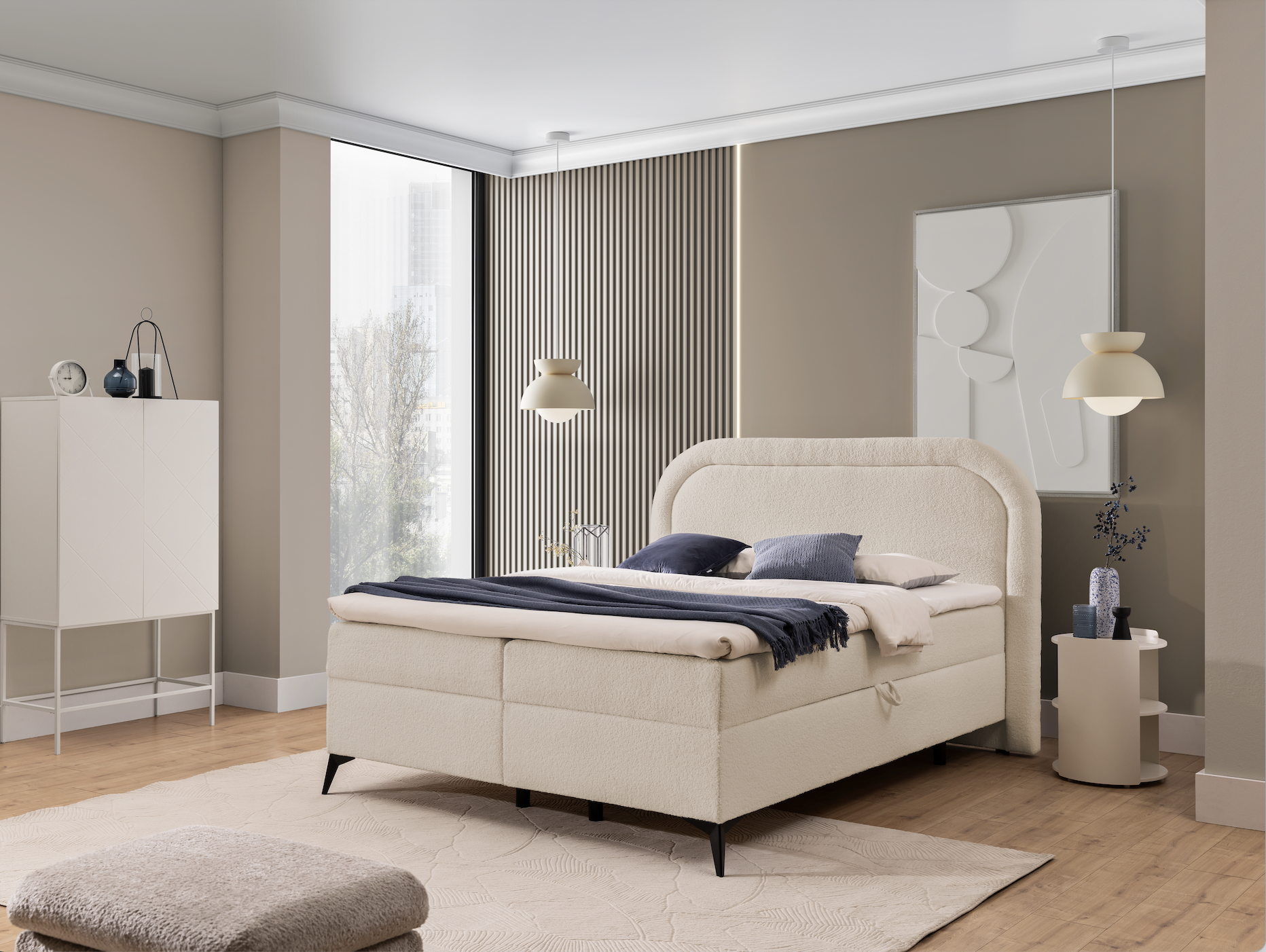 Łóżko kontynentalne z pojemnikiem na pościel Hug Me to połączenie nowoczesnej formy, przytulnej estetyki i wysokiego komfortu snu. Jego miękka, zaokrąglona bryła doskonale wpisuje się w aktualne trendy wnętrzarskie, a tapicerka z wysokiej jakości tkaniny bouclé nadaje całości elegancki, a jednocześnie ciepły charakter.