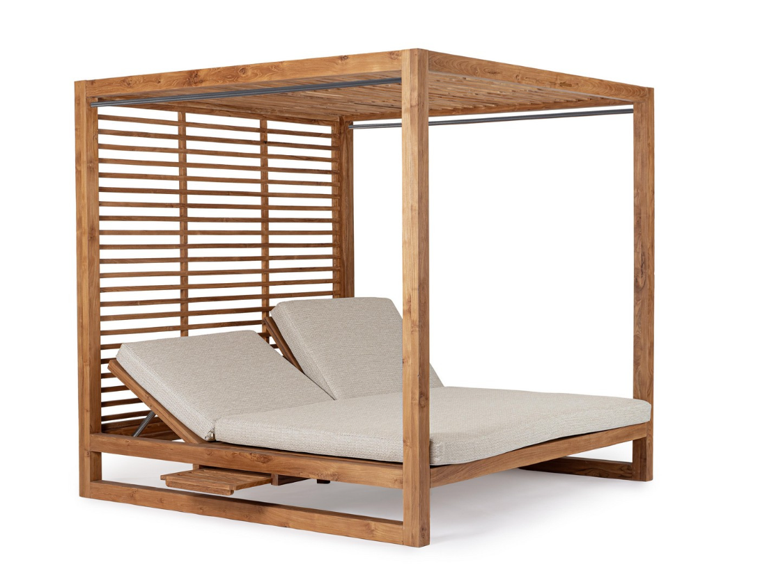 Łóżko ogrodowe Honolulu z ekskluzywnej kolekcji Bizzotto Homemotion to mebel, który przemieni Twój taras w strefę relaksu rodem z najlepszych, egzotycznych hoteli. Ta imponująca konstrukcja w formie otwartej kabany z wysoką ramą została w całości wykonana z naturalnego drewna tekowego posiadającego certyfikat FSC (100%). Oznacza to, że surowiec pozyskano z legalnych, odpowiedzialnie zarządzanych upraw. Drewno pozostawiono w jego pięknym, surowym wykończeniu, które zachwyca naturalnym usłojeniem.