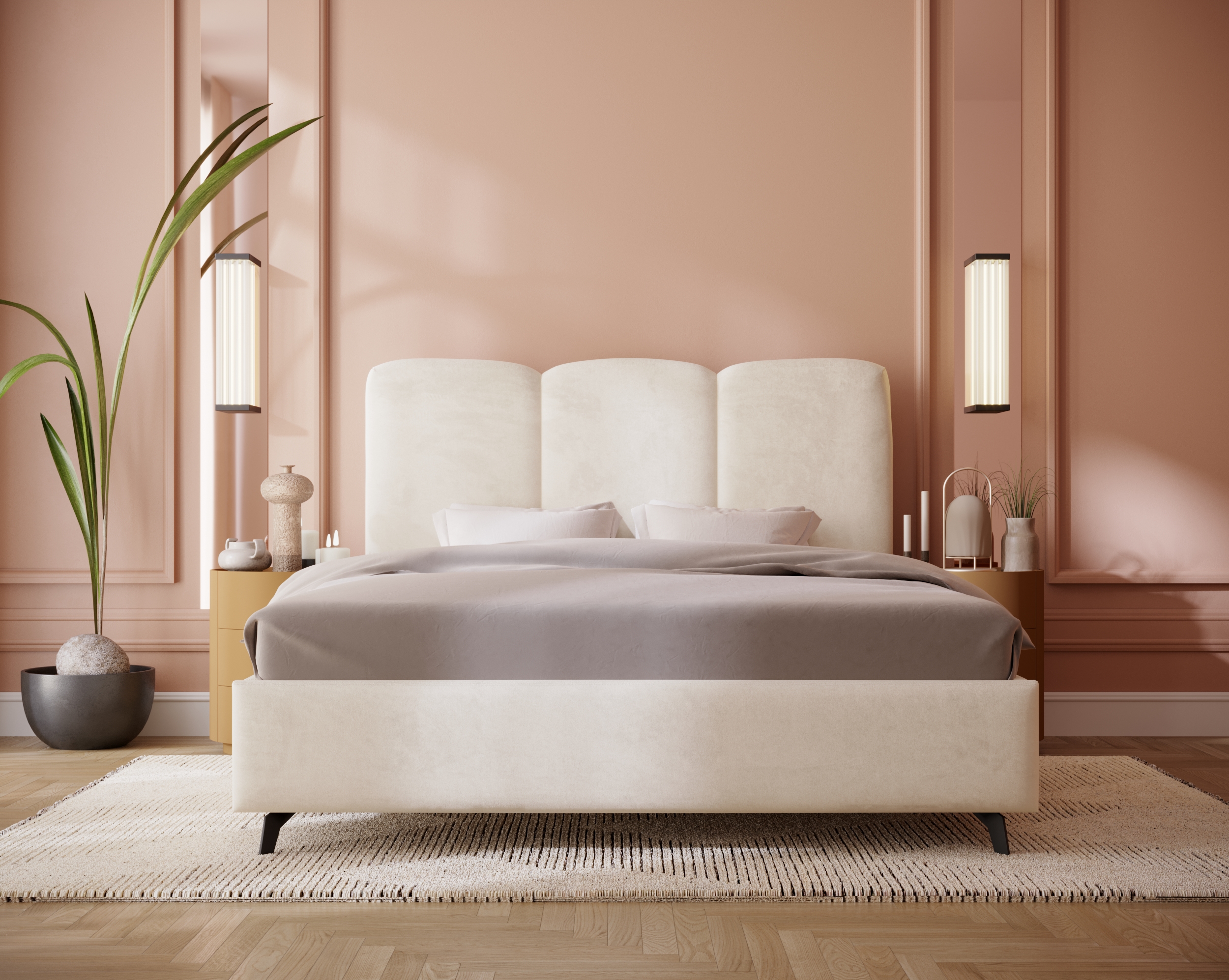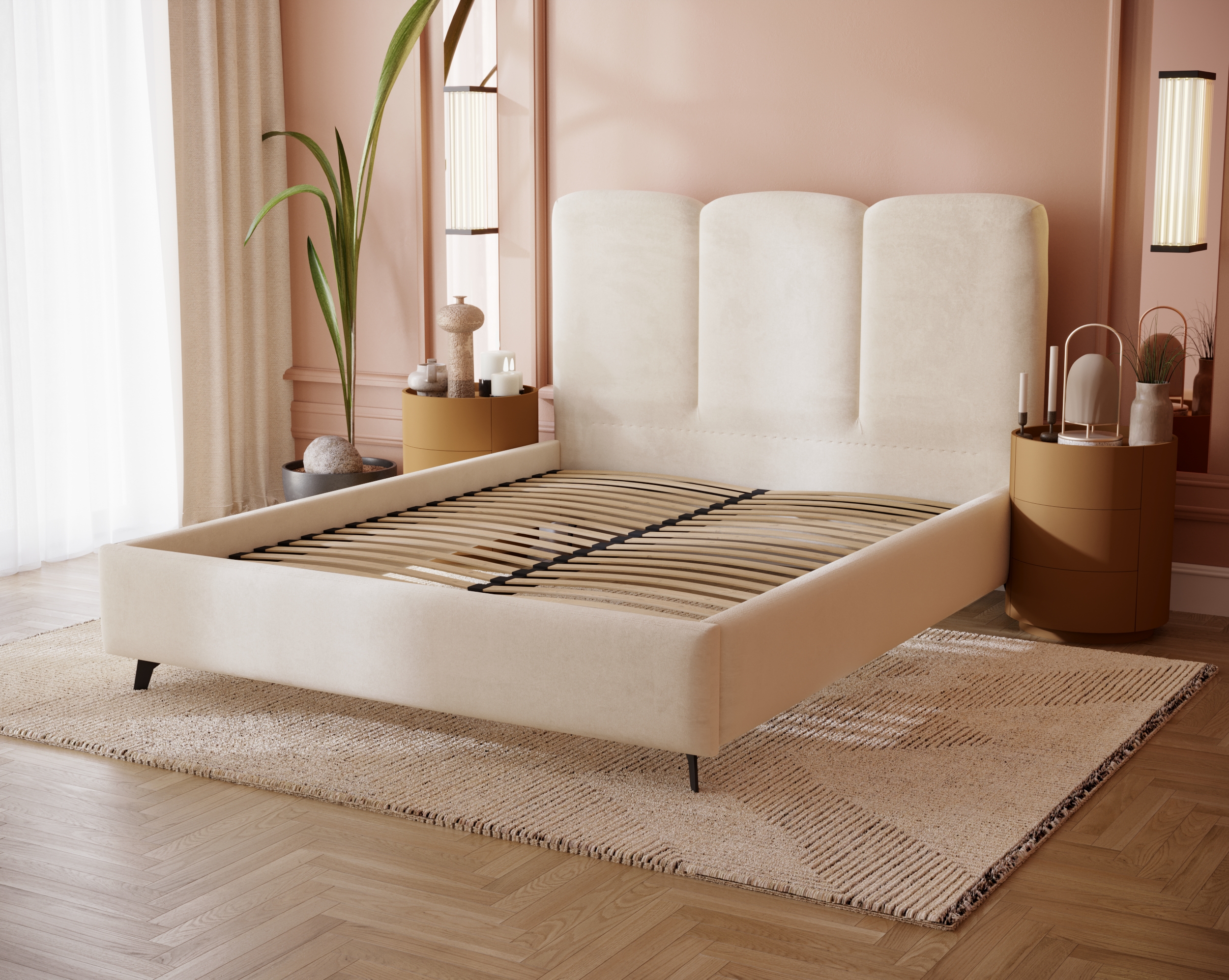 Łóżko Roll to elegancka propozycja, która łączy minimalistyczny styl z nutą nowoczesnej lekkości. Charakterystycznym elementem jest wysoki, zaokrąglony zagłówek podzielony na trzy pionowe części, który nadaje bryle subtelnego rytmu i sprawia, że mebel świetnie prezentuje się zarówno w nowoczesnych, jak i klasycznych aranżacjach. Smukłe, delikatnie zwężane nóżki dodają konstrukcji wizualnej lekkości, dzięki czemu łóżko nie przytłacza przestrzeni, a jednocześnie zachowuje stabilność i elegancję.
