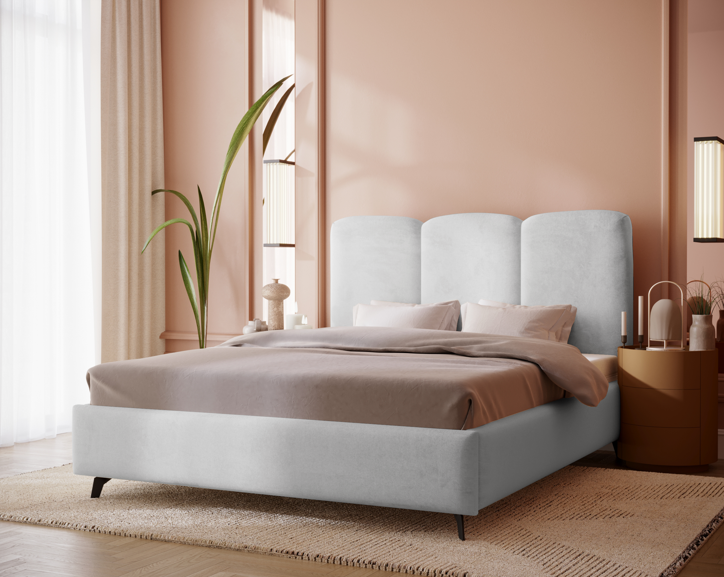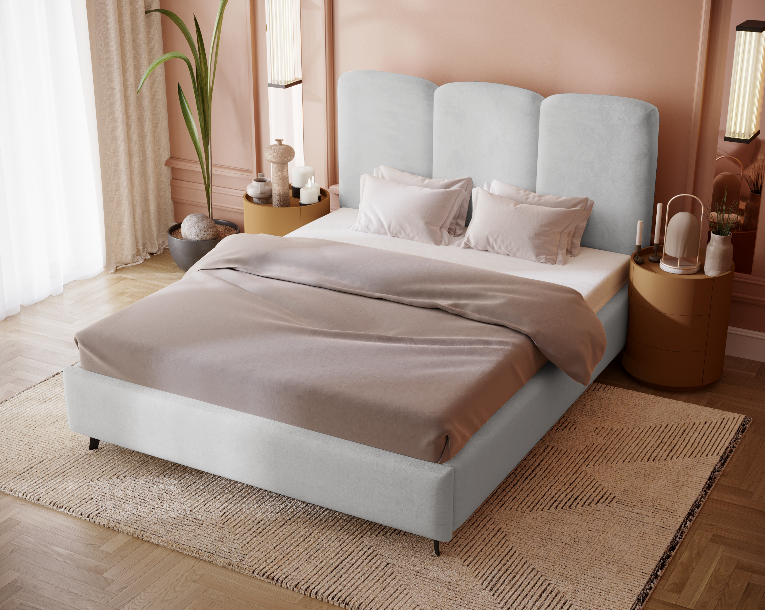 Łóżko Roll to elegancka propozycja, która łączy minimalistyczny styl z nutą nowoczesnej lekkości. Charakterystycznym elementem jest wysoki, zaokrąglony zagłówek podzielony na trzy pionowe części, który nadaje bryle subtelnego rytmu i sprawia, że mebel świetnie prezentuje się zarówno w nowoczesnych, jak i klasycznych aranżacjach. Smukłe, delikatnie zwężane nóżki dodają konstrukcji wizualnej lekkości, dzięki czemu łóżko nie przytłacza przestrzeni, a jednocześnie zachowuje stabilność i elegancję.