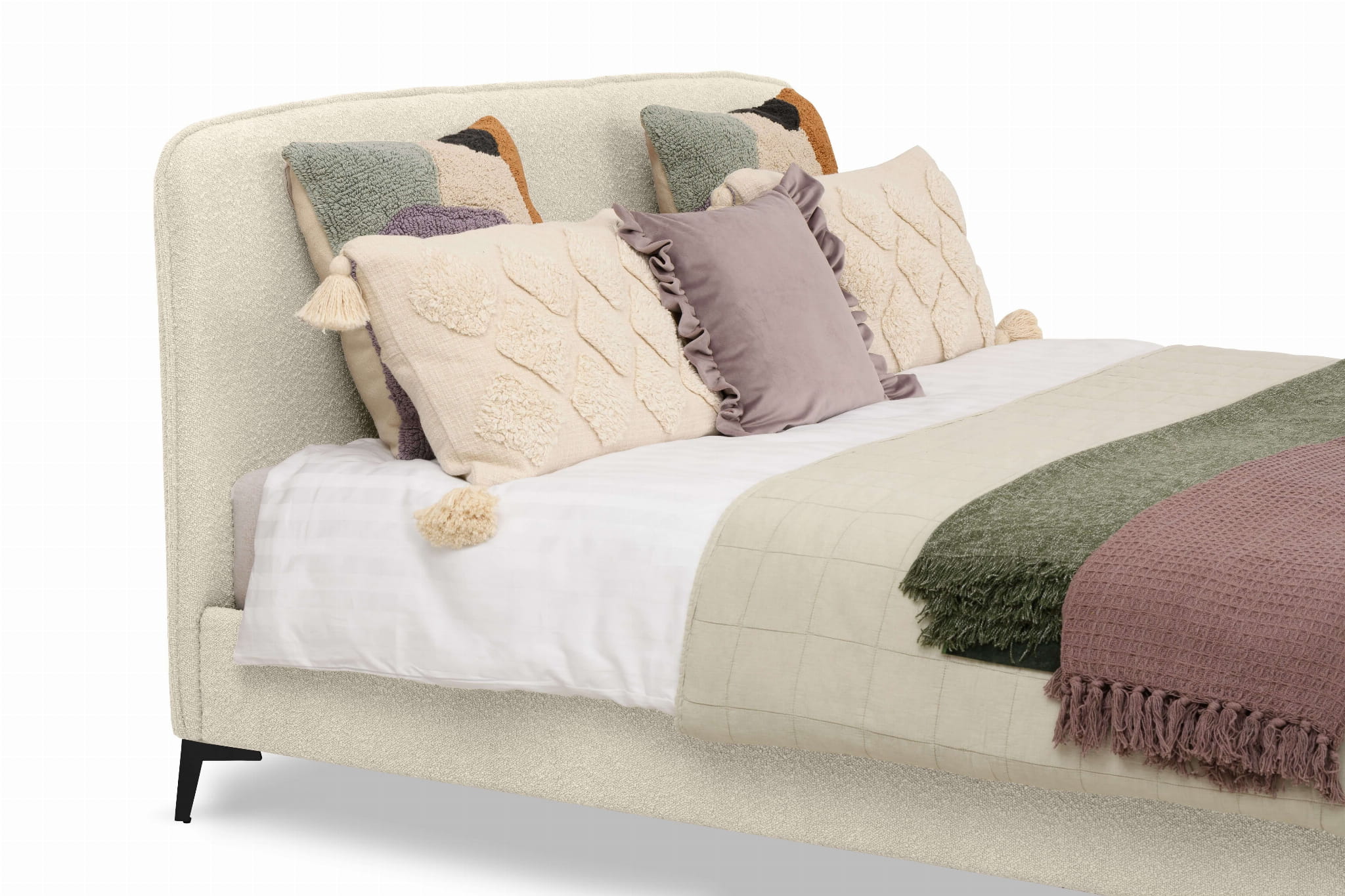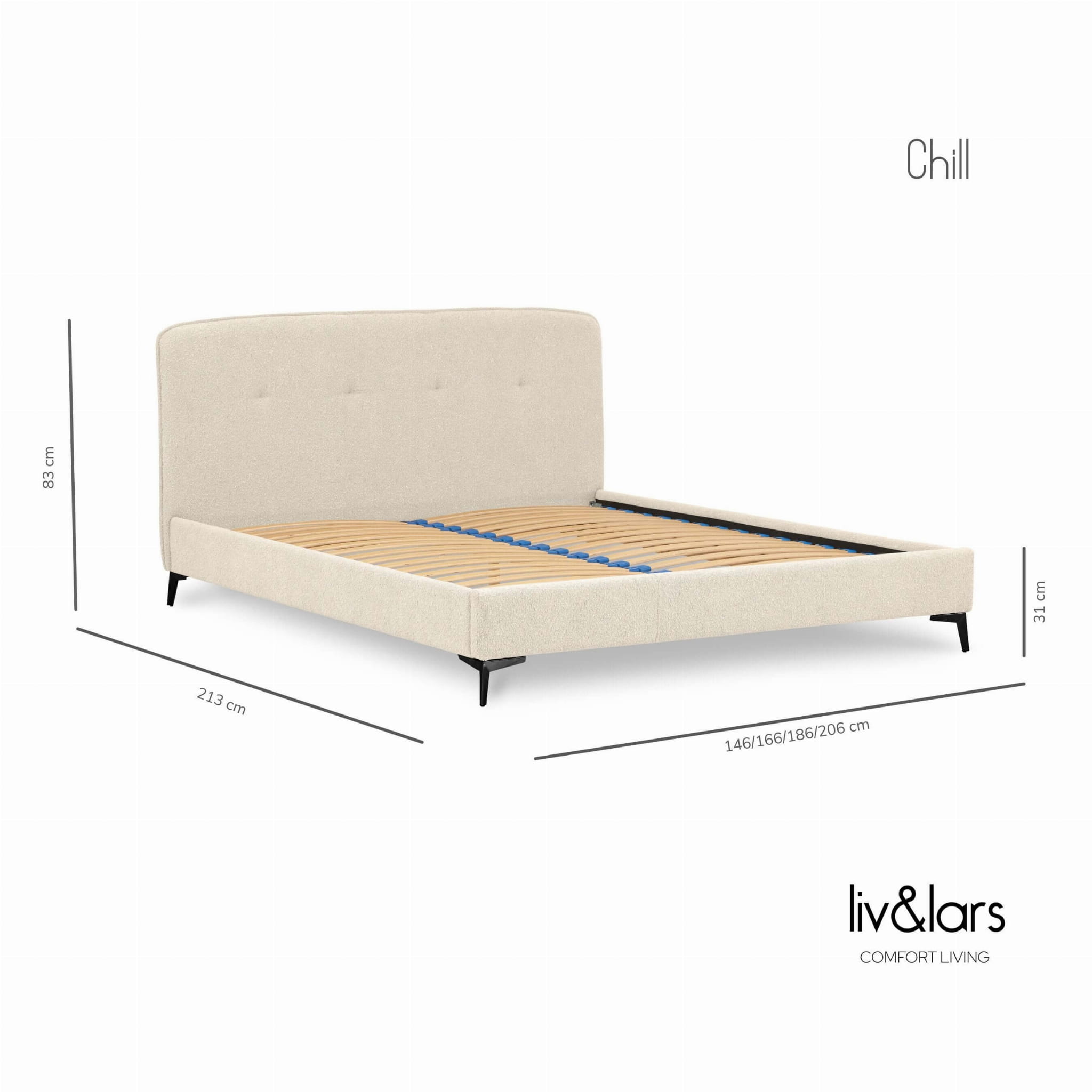Chill to łóżko, które przykuwa uwagę niebanalnym, zaokrąglonym kształtem wezgłowia. Zagłówek, jak i całe łóżko, obity jest miękką tkaniną typu boucle, dzięki czemu, poza świetną prezencją, doskonale sprawdzi się podczas wieczornej lektury czy niedzielnego śniadania w łóżku, dając wygodne oparcie Twoim plecom. Łóżko nie posiada pojemnika na pościel.