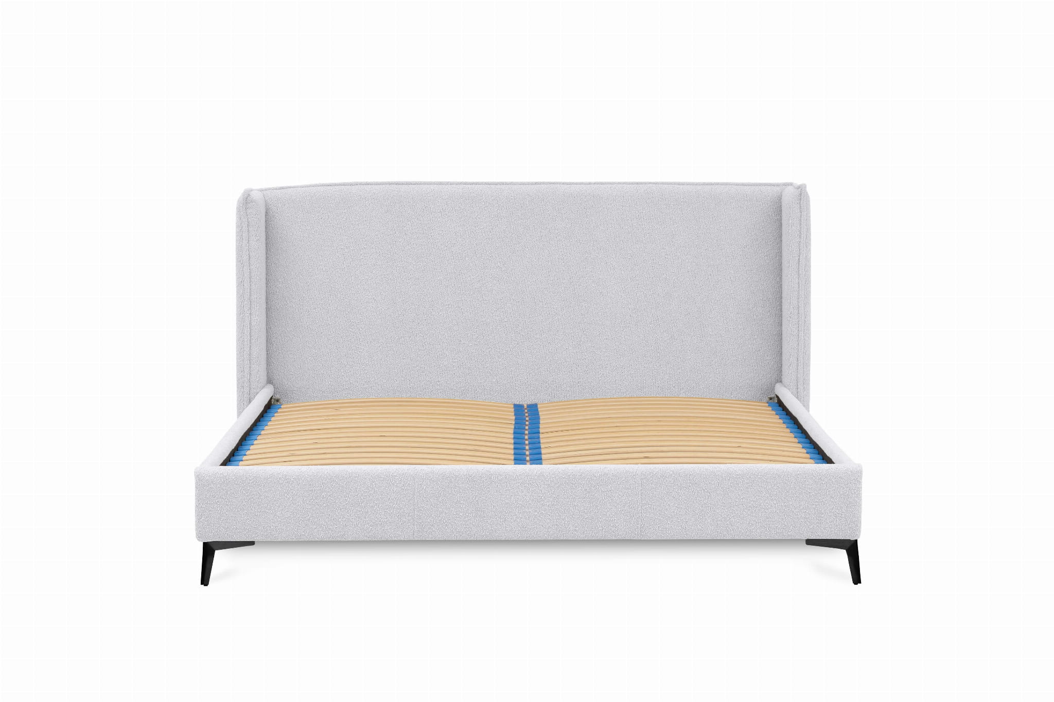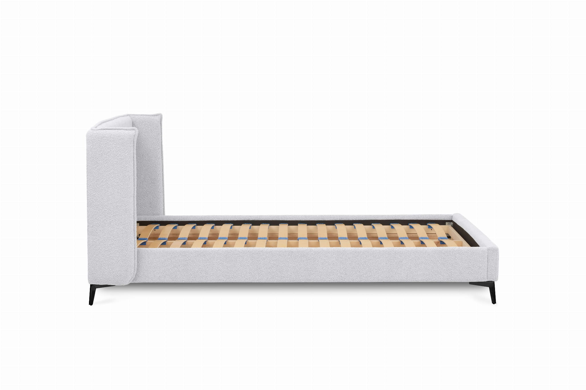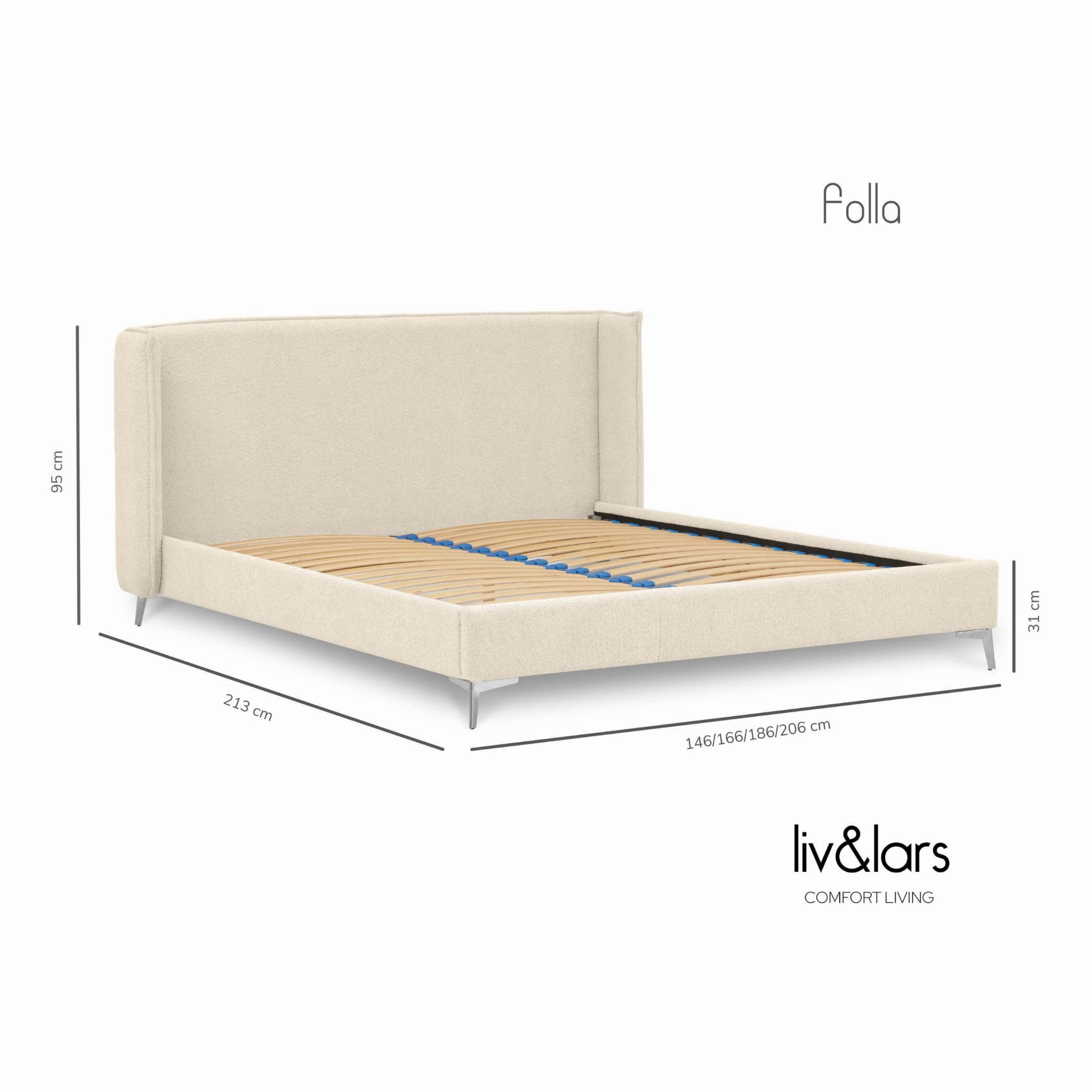 Folla to łóżko, które przykuwa uwagę niebanalnym wykończeniem wezgłowia. Zagłówek, jak i całe łóżko, obity jest miękką tkaniną typu boucle, dzięki czemu, poza świetną prezencją, doskonale sprawdzi się podczas wieczornej lektury czy niedzielnego śniadania w łóżku, dając wygodne oparcie Twoim plecom. Łóżko nie posiada pojemnika na pościel.