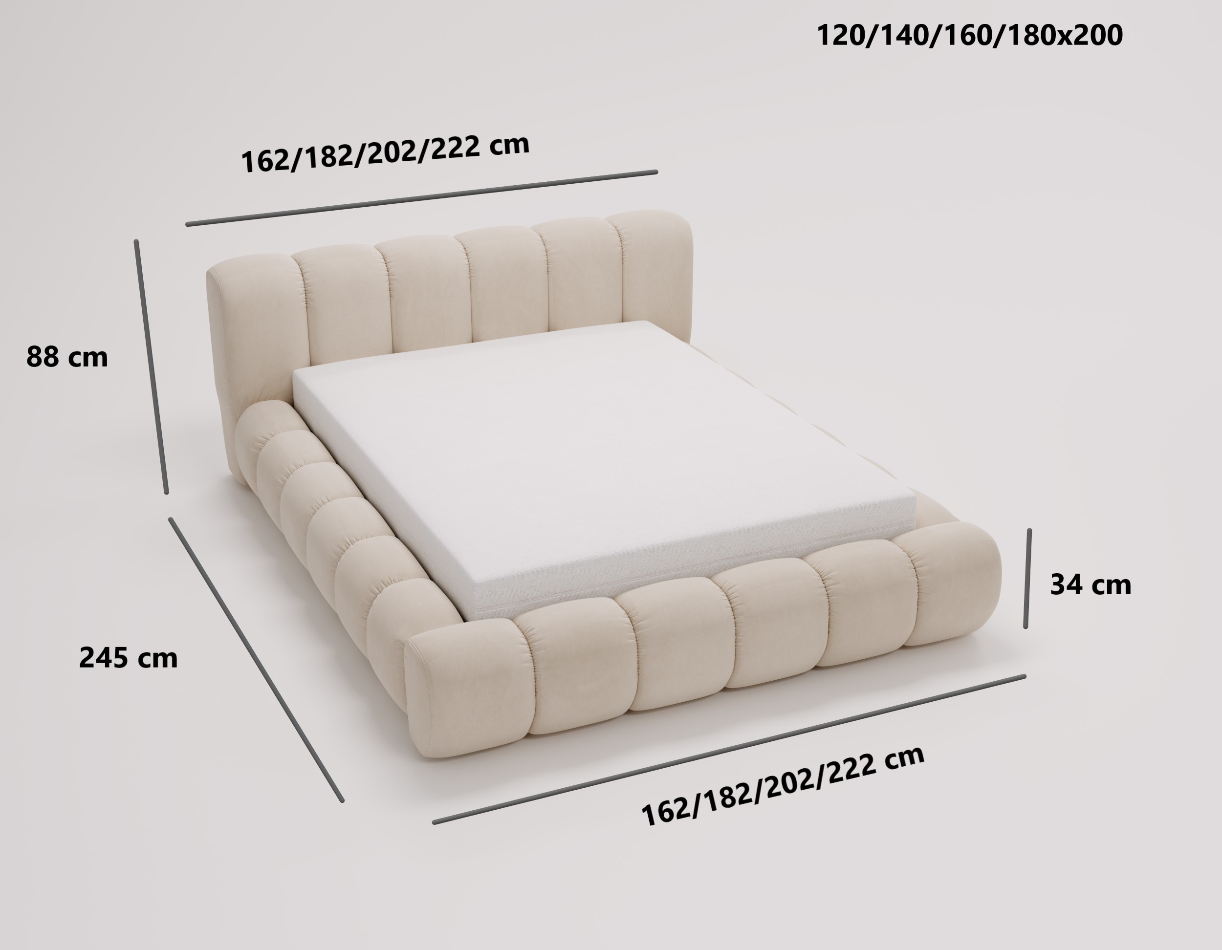 Łóżko wyposażone jest w pojemny schowek na pościel, otwierany za pomocą solidnego mechanizmu podnoszenia stelaża. Dzięki temu w prosty sposób zyskujesz dodatkową przestrzeń do przechowywania kołder, poduszek czy sezonowych tekstyliów. Model Bubbly dostępny jest w kilku rozmiarach do wyboru: 120x200, 140x200, 160x200 oraz 180x200 cm, co pozwala dopasować go do wielkości sypialni i indywidualnych potrzeb. Łóżko można zamówić w różnych wariantach kolorystycznych, aby idealnie współgrało z wystrojem wnętrza – od eleganckich, stonowanych odcieni po nowoczesne, jasne barwy.
