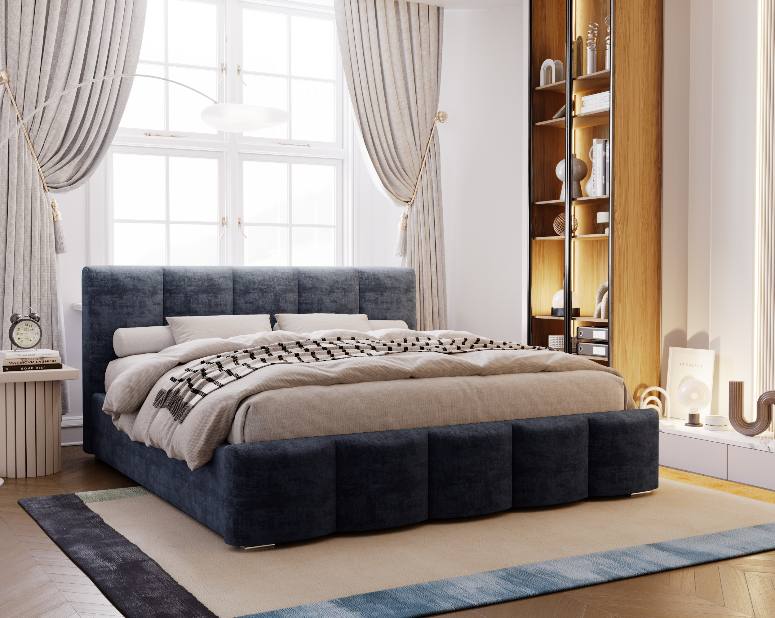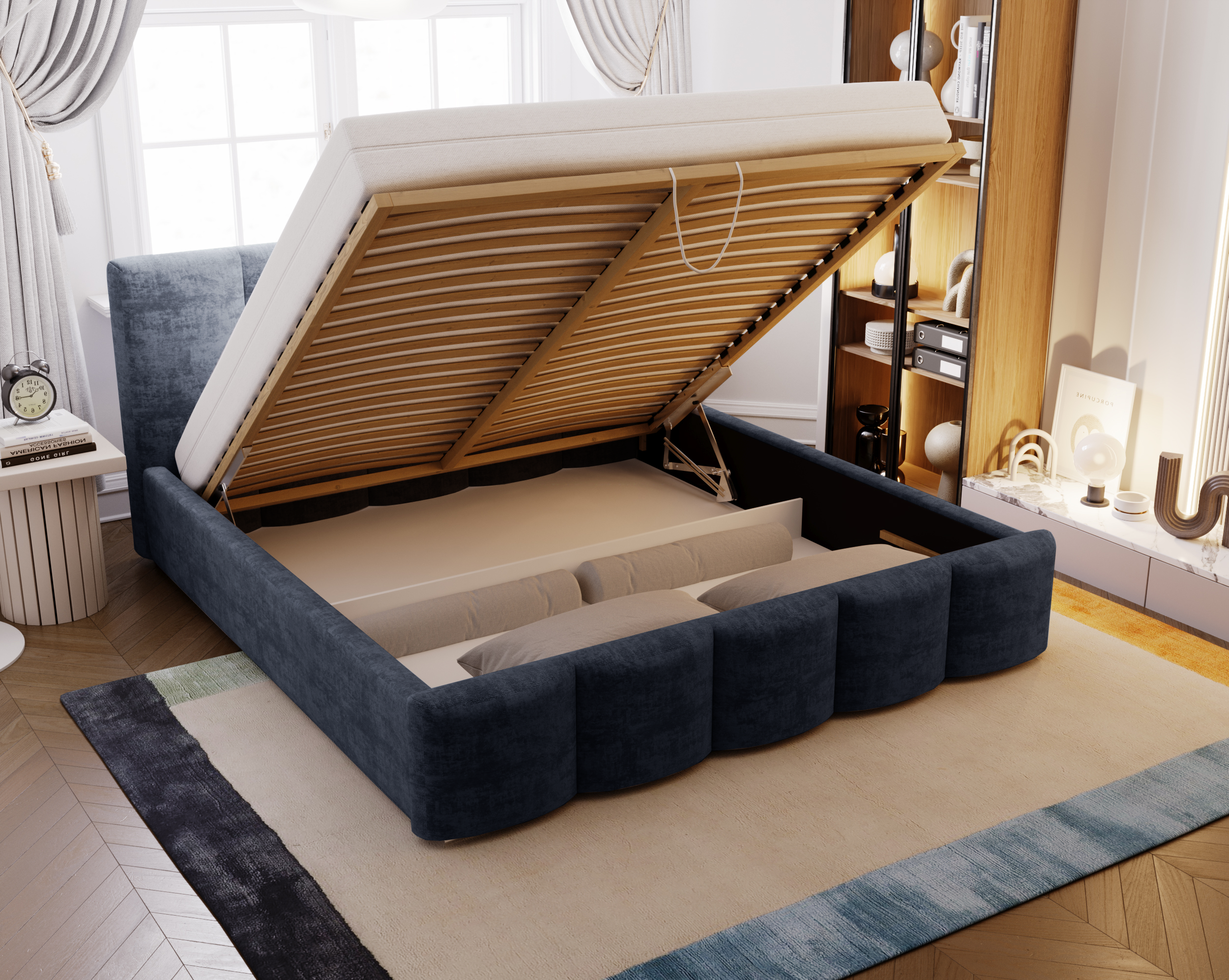 Łóżko tapicerowane z pojemnikiem Crush granatowe