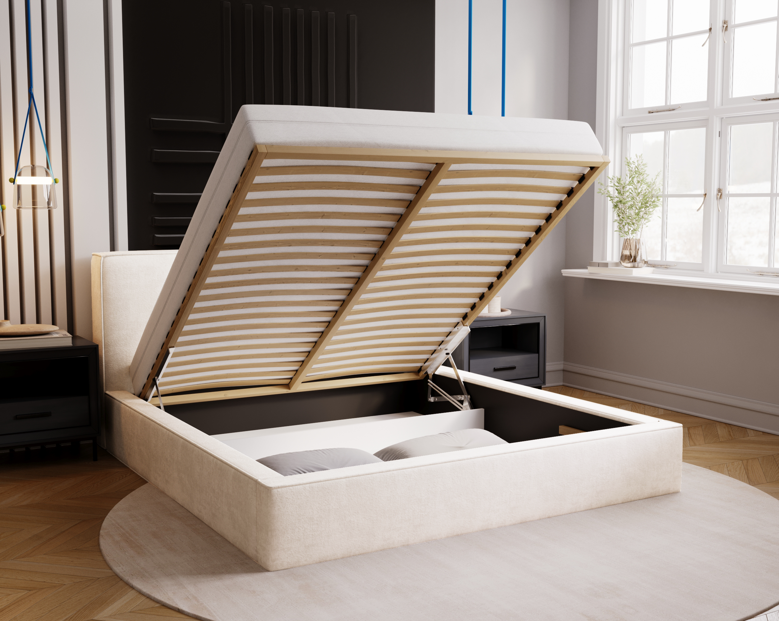 Model Eternity został wyposażony w pojemny schowek na pościel z łatwym systemem otwierania – idealne rozwiązanie dla osób ceniących funkcjonalność i estetykę w jednym. Solidna konstrukcja oparta na drewnianym stelażu gwarantuje trwałość i stabilność przez lata użytkowania.