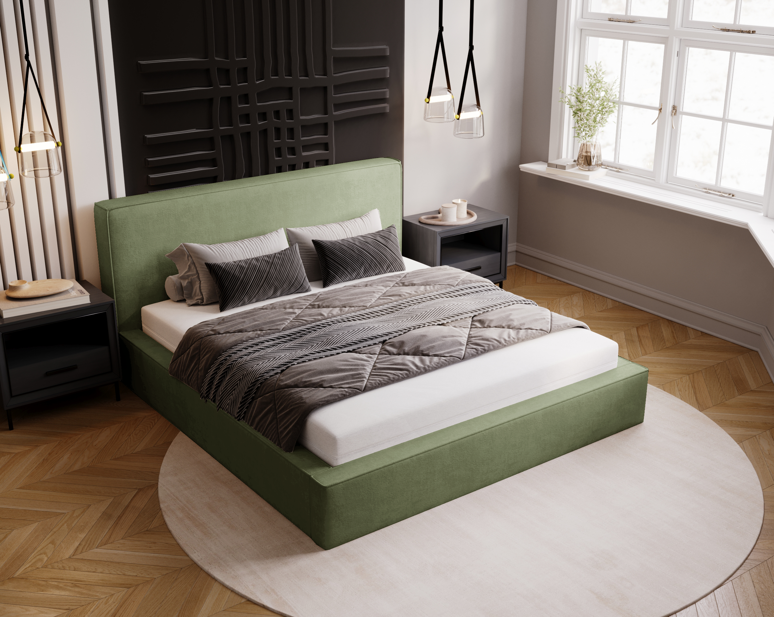 Łóżko tapicerowane z pojemnikiem Eternity oliwkowe