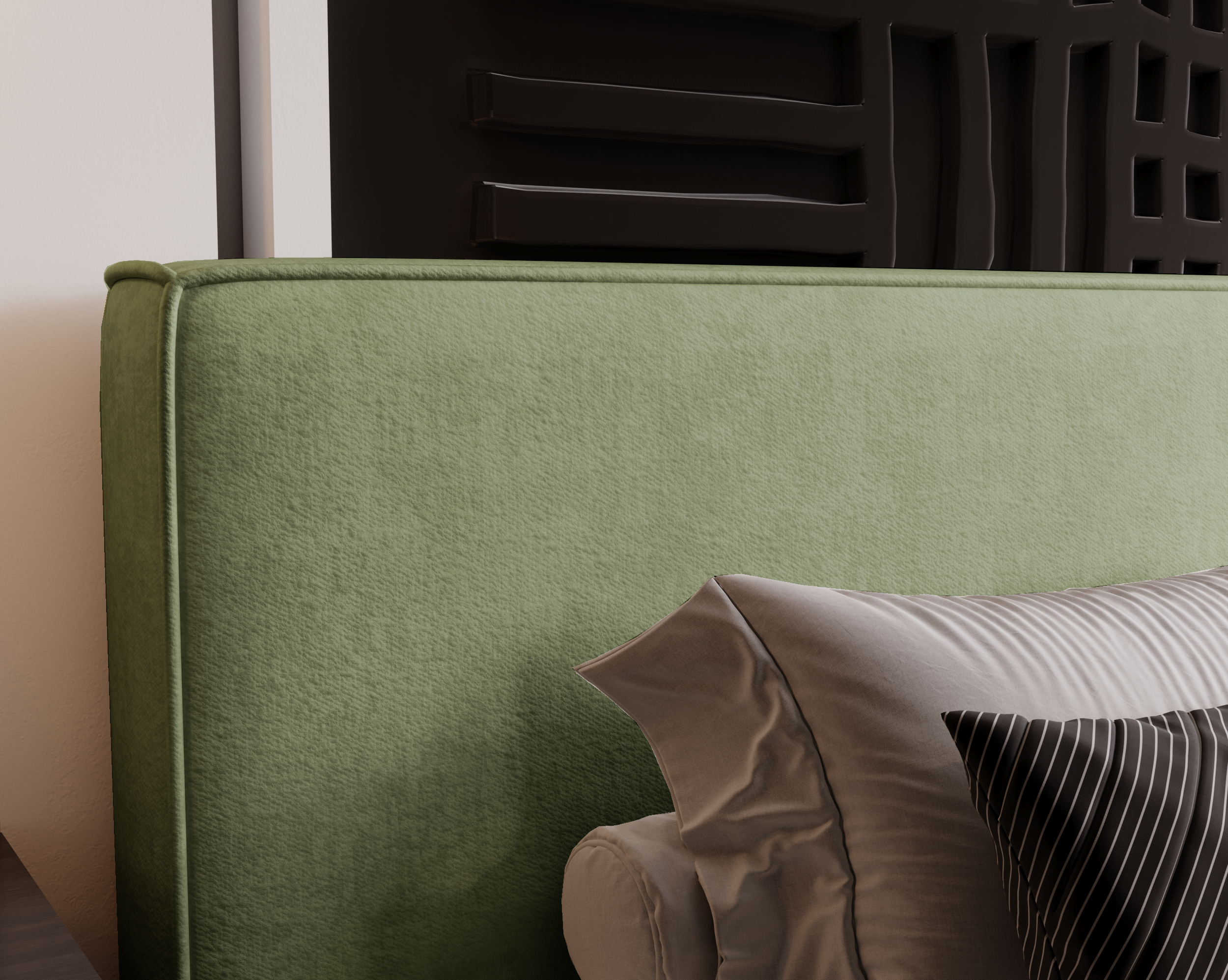 Wezgłowie utrzymane w geometrycznym, prostym kształcie wprowadza do wnętrza spokój i porządek, stanowiąc idealne tło zarówno dla klasycznych, jak i nowoczesnych aranżacji sypialni. Delikatne przeszycia i miękkie linie dodają mu lekkości, jednocześnie zachowując solidny, wyważony wygląd.