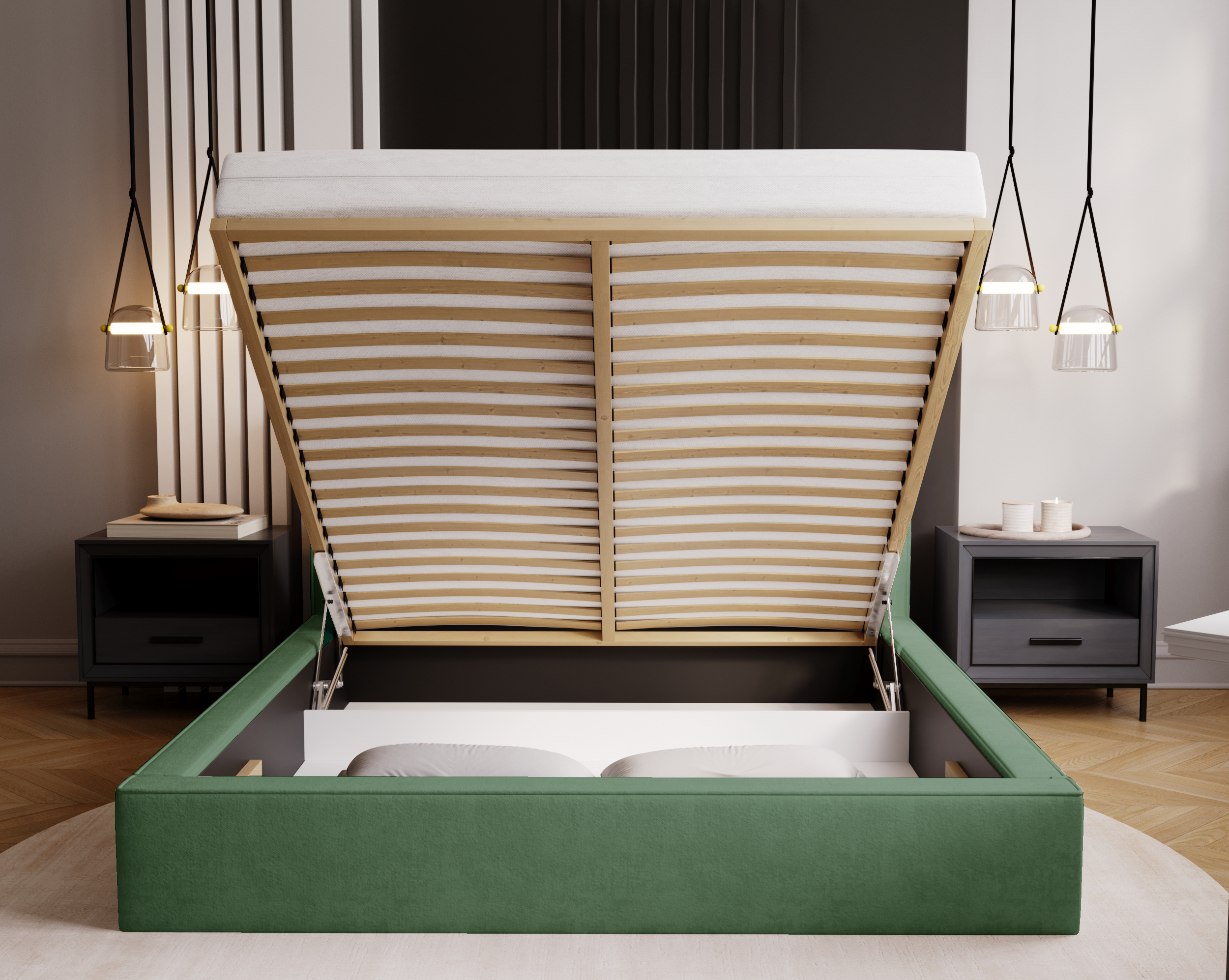 Model Eternity został wyposażony w pojemny schowek na pościel z łatwym systemem otwierania – idealne rozwiązanie dla osób ceniących funkcjonalność i estetykę w jednym. Solidna konstrukcja oparta na drewnianym stelażu gwarantuje trwałość i stabilność przez lata użytkowania.