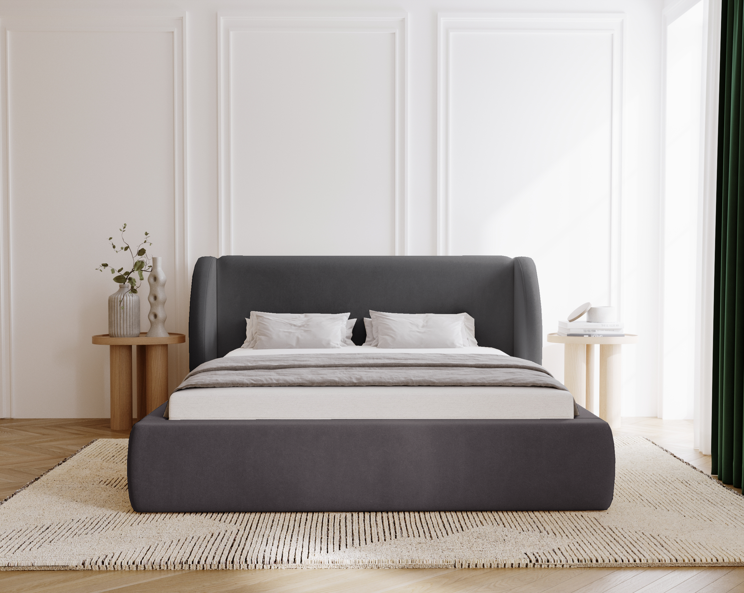 Cała bryła łóżka została zaprojektowana w harmonijny sposób – gładkie, pełne linie ramy podkreślają ponadczasowy design i sprawiają, że mebel prezentuje się wyjątkowo estetycznie z każdej perspektywy. Dodatkową funkcjonalność zapewnia przestronny pojemnik na pościel, otwierany za pomocą solidnego mechanizmu z podnośnikami, który umożliwia wygodne przechowywanie niezbędnych tekstyliów.