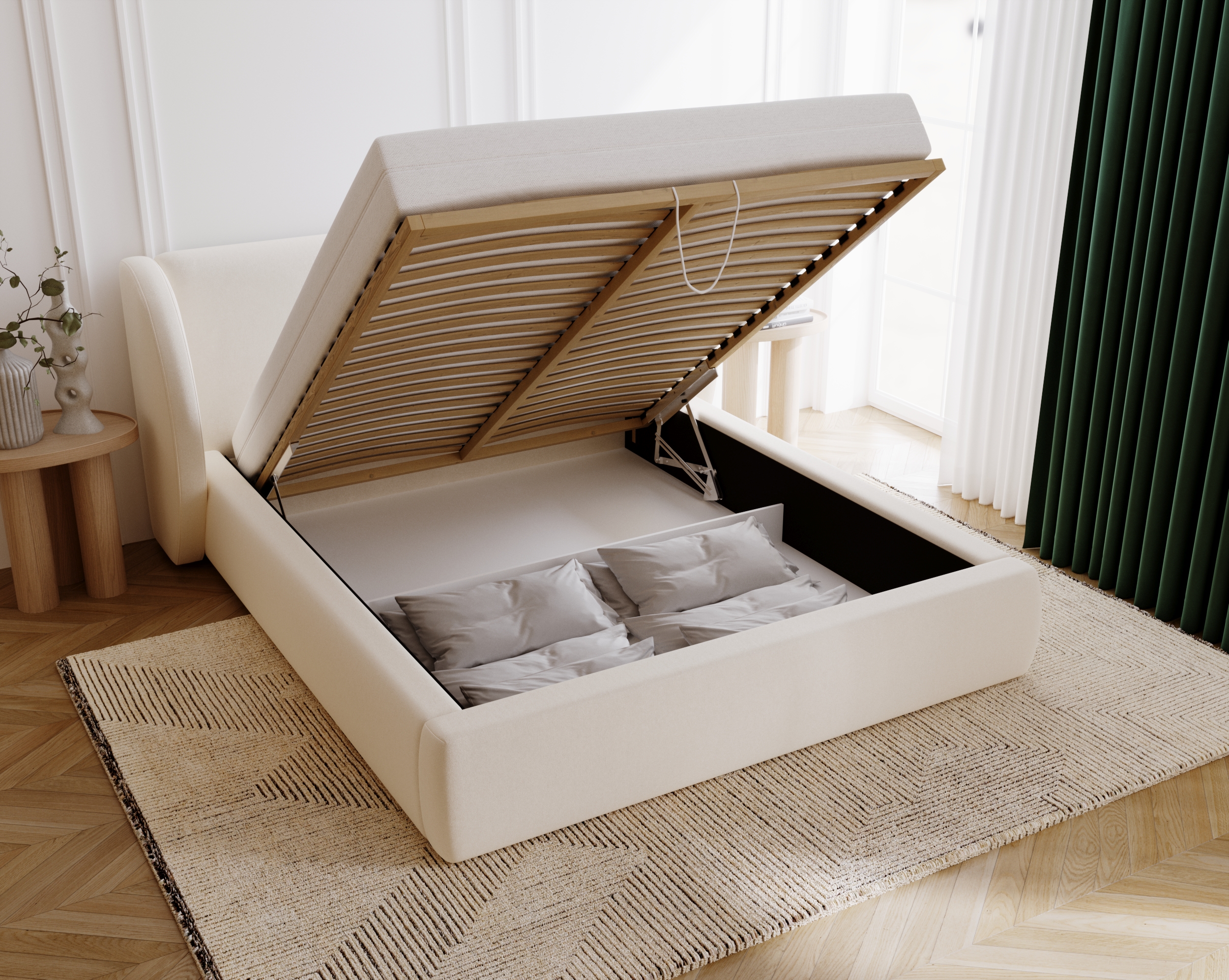 Cała bryła łóżka została zaprojektowana w harmonijny sposób – gładkie, pełne linie ramy podkreślają ponadczasowy design i sprawiają, że mebel prezentuje się wyjątkowo estetycznie z każdej perspektywy. Dodatkową funkcjonalność zapewnia przestronny pojemnik na pościel, otwierany za pomocą solidnego mechanizmu z podnośnikami, który umożliwia wygodne przechowywanie niezbędnych tekstyliów.
