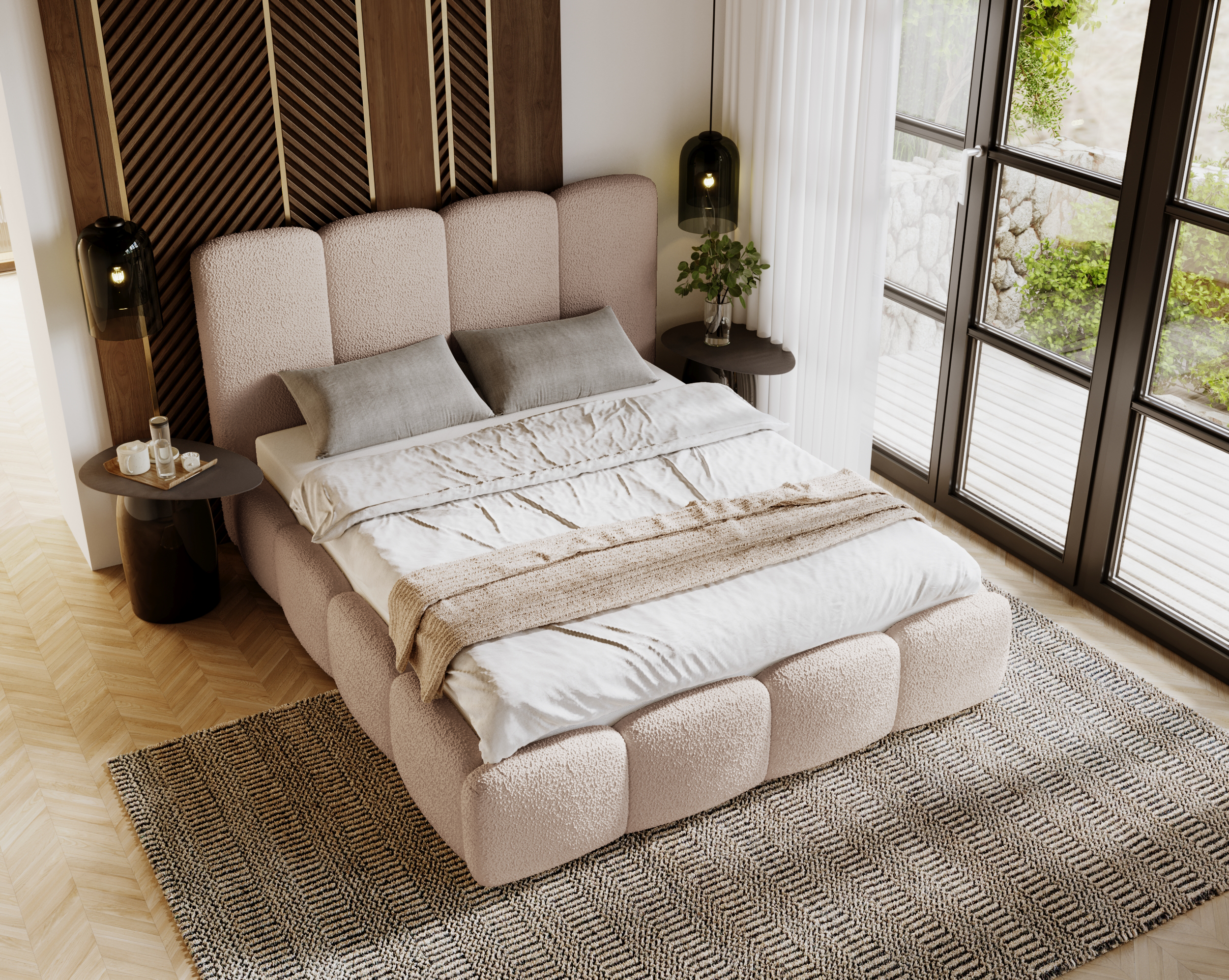 Łóżko Lumio z pojemnikiem na pościel to nowoczesna propozycja dla osób, które cenią funkcjonalność i wyjątkowy design. Charakterystyczne wezgłowie o geometrycznej formie, złożone z miękkich, zaoblonych paneli, nadaje bryle łóżka elegancki i lekko architektoniczny charakter. Obłe kształty ramy i zagłówka tworzą harmonijną całość, która wprowadza do sypialni atmosferę przytulności i luksusu.