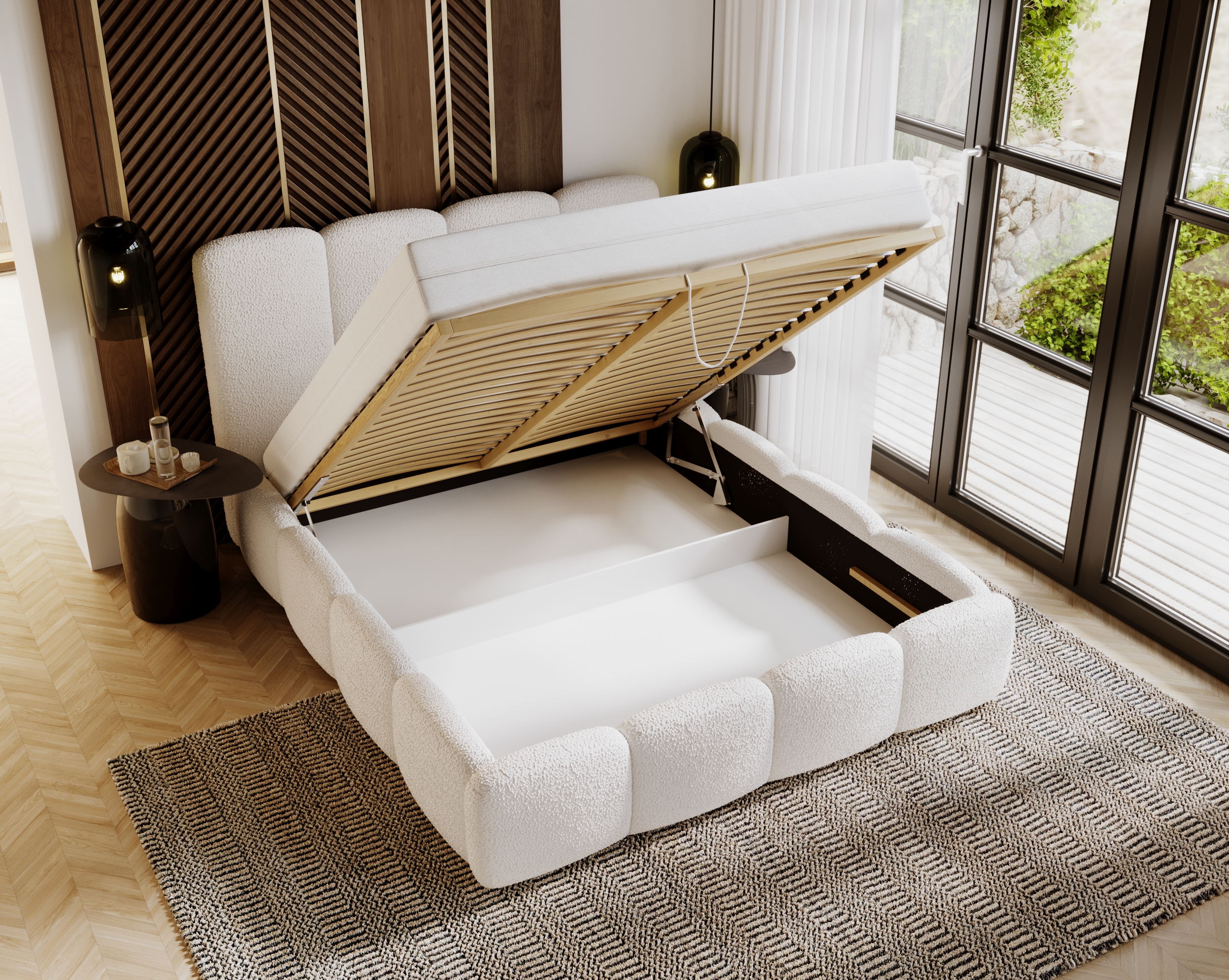 Łóżko tapicerowane z pojemnikiem Lumio boucle beżowe