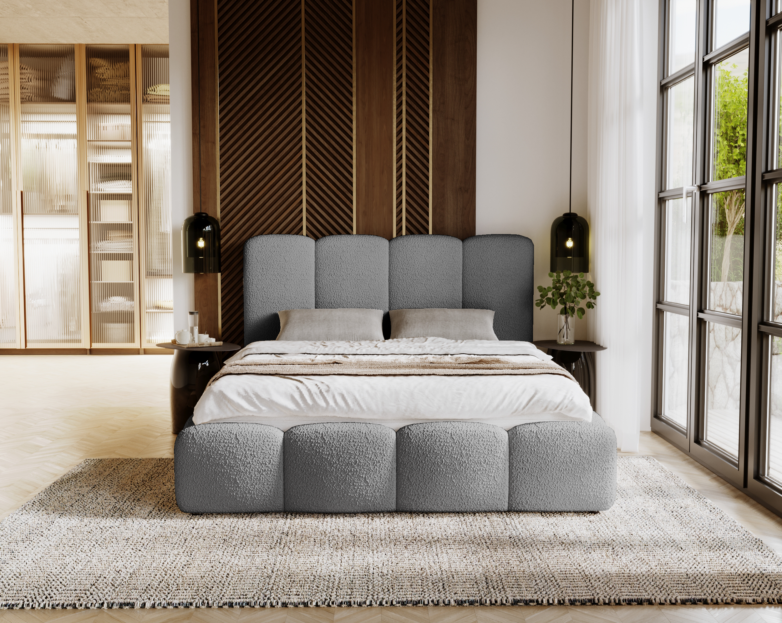 Łóżko Lumio z pojemnikiem na pościel to nowoczesna propozycja dla osób, które cenią funkcjonalność i wyjątkowy design. Charakterystyczne wezgłowie o geometrycznej formie, złożone z miękkich, zaoblonych paneli, nadaje bryle łóżka elegancki i lekko architektoniczny charakter. Obłe kształty ramy i zagłówka tworzą harmonijną całość, która wprowadza do sypialni atmosferę przytulności i luksusu.