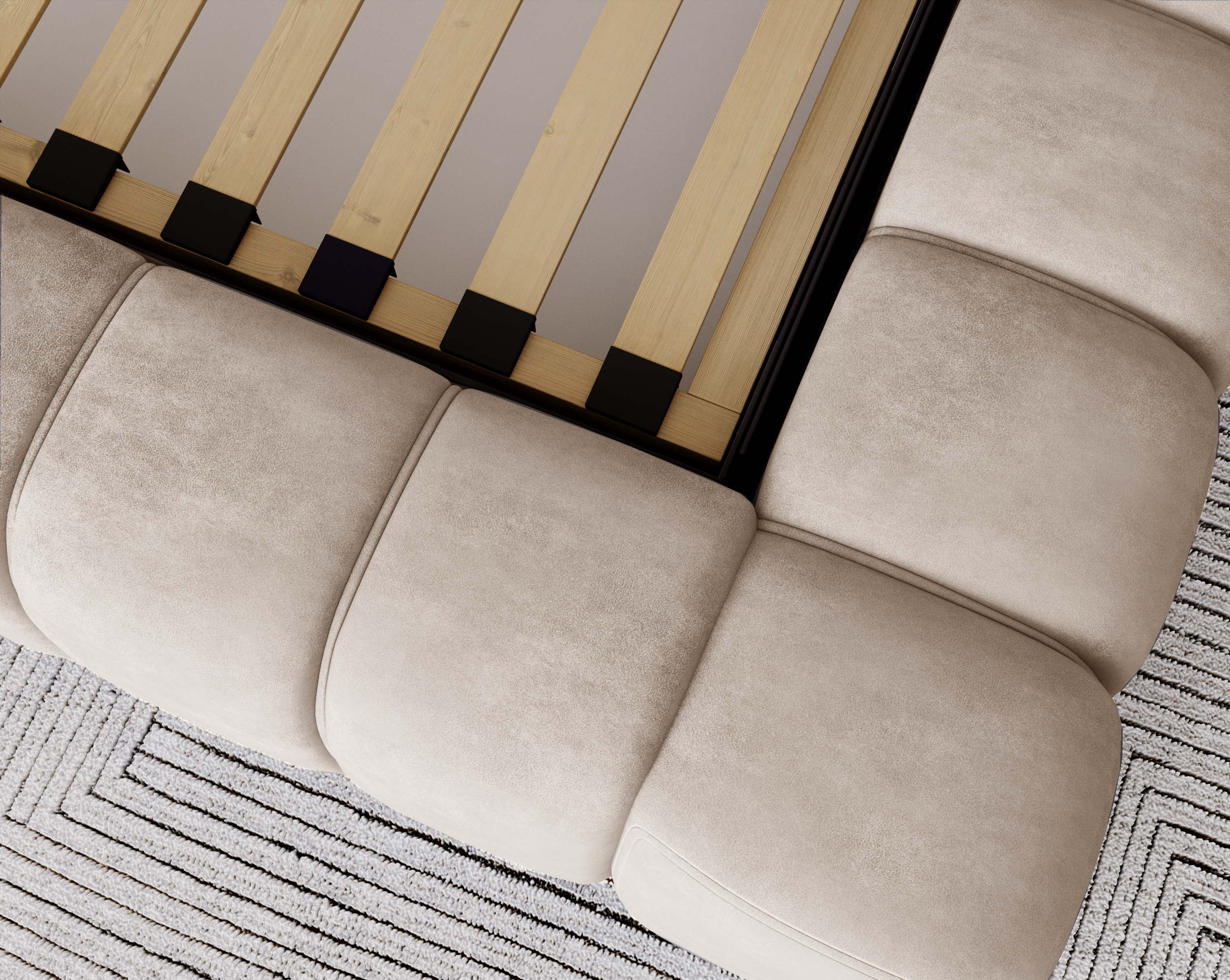 Model Pretty utrzymany jest w stonowanej, naturalnej palecie kolorów, inspirowanej barwami ziemi i natury – od subtelnych beżów po eleganckie zielenie i błękity. Dzięki temu idealnie wpisuje się zarówno w nowoczesne, minimalistyczne wnętrza, jak i w aranżacje o cieplejszym, bardziej przytulnym charakterze. Geometryczna, pełna forma łóżka podkreślona wyrazistymi przeszyciami nadaje mu stylowego, współczesnego wyglądu.