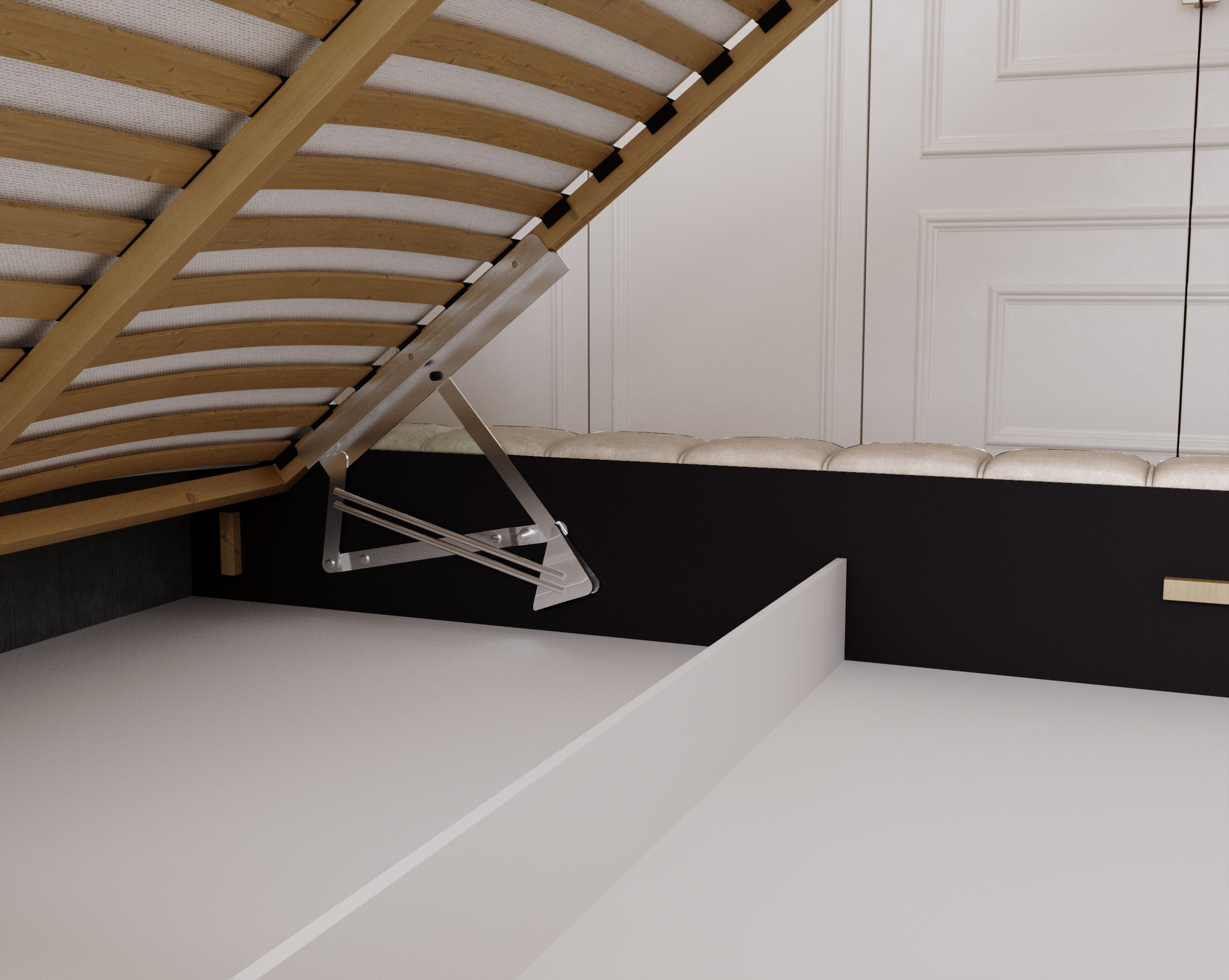 Łóżko Pretty wyposażone zostało w pojemny schowek na pościel, do którego dostęp ułatwia solidny, podnoszony stelaż. Dostępne jest w kilku rozmiarach – 120x200, 140x200, 160x200 oraz 180x200 cm – co pozwala idealnie dopasować je do przestrzeni i indywidualnych potrzeb.