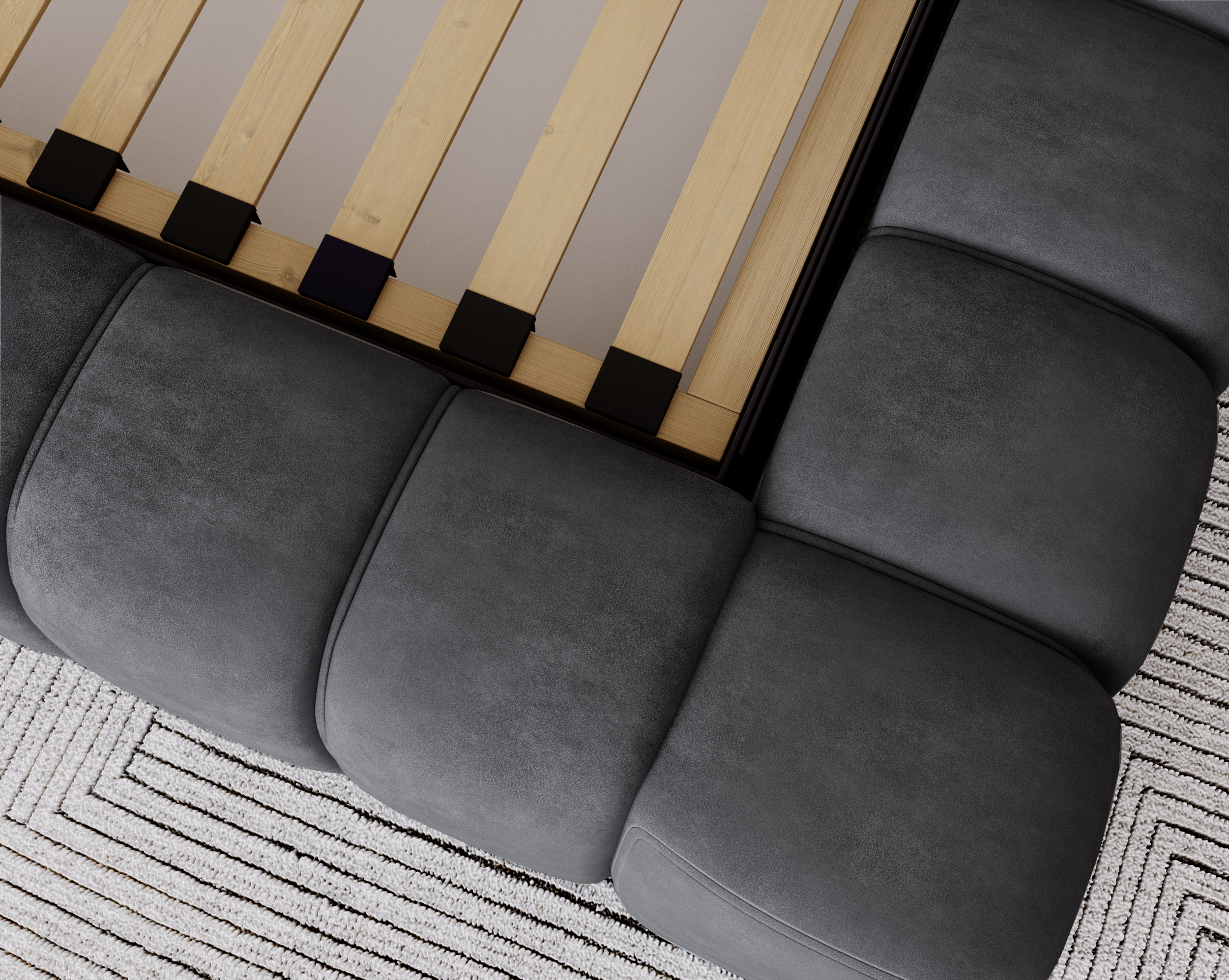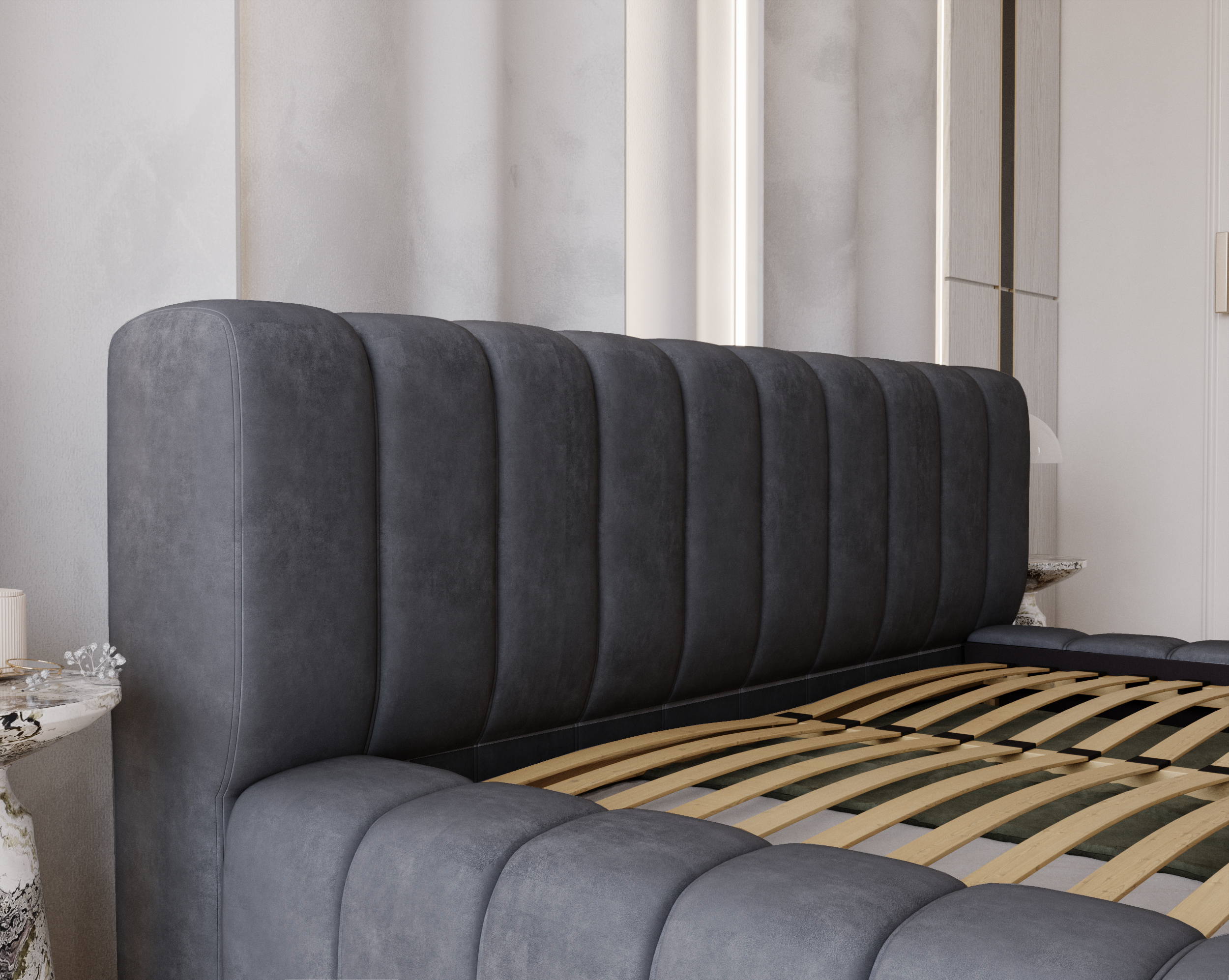 Łóżko tapicerowane jest materiałem Whisper 15, który wyróżnia się niezwykłą trwałością i komfortem. Tkanina posiada aż 100 000 cykli w teście Martindale’a, co gwarantuje odporność na ścieranie i zachowanie doskonałego wyglądu przez długie lata użytkowania. Jest przyjemna i miękka w dotyku, a dzięki swojej objętości dodaje bryle mebla jeszcze bardziej luksusowego charakteru. To materiał stworzony z myślą o meblach wypoczynkowych, zapewniający komfort oraz elegancki wygląd na lata.