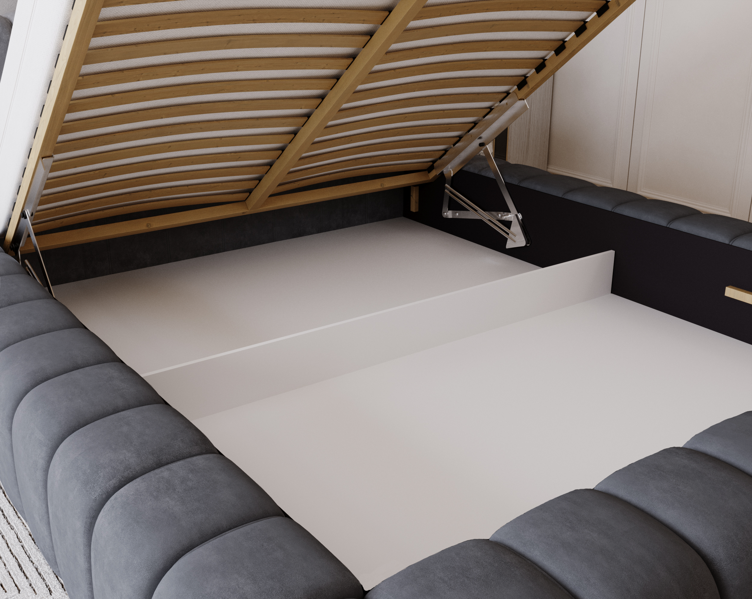 Łóżko Pretty wyposażone zostało w pojemny schowek na pościel, do którego dostęp ułatwia solidny, podnoszony stelaż. Dostępne jest w kilku rozmiarach – 120x200, 140x200, 160x200 oraz 180x200 cm – co pozwala idealnie dopasować je do przestrzeni i indywidualnych potrzeb.